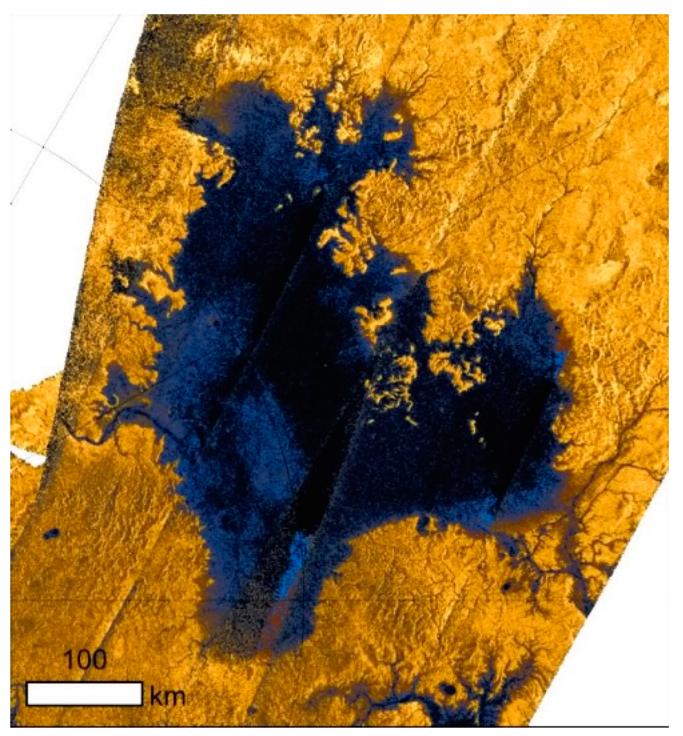 - Sotin, C.; Lawrence, K.J.; Reinhardt, B.; Barnes, J.W.; Brown, R.H.; Hayes, A.G.; le Mouélic, S.; Rodriguez, S.; Soderblom, J.M.; Soderblom, L.A.; et al. Observations of Titan’s northern lakes at 5 microns: Implications for the organic cycle and geology. Icarus 2012, 221, 768–786. [Google Scholar] [CrossRef]
