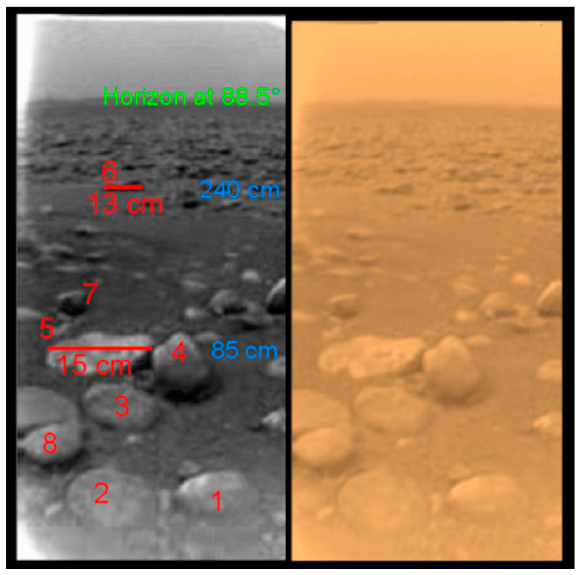 Titan’s surface at the Huygens landing site, 10.2°S, 192.4°W. There are at least eight rocks visible in the image—numbered in red with size indicated for two of them. Distance from the lander is shown in blue and the horizon at 88.5° is labeled in green. The small rocks are thought to be H2O ice mostly coated by organic solid material. The rounded nature of these rocks suggests past fluvial activity. The right panel shows, approximately, the true color of the scene. Direct measurements by the Huygens probe indicated that the ground at the landing was moist with methane and ethane at the time of the landing, 14 January 2005. Image from ESA.