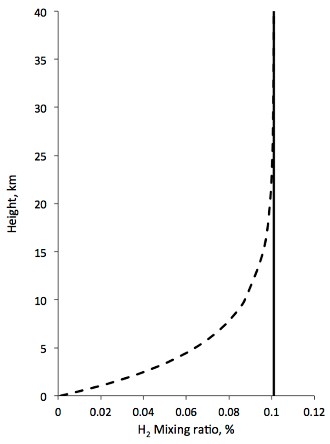 Schematic of expected H2 concentration in the lower atmosphere without a biological sink at the surface (solid line) and with a biological sink (dotted line).