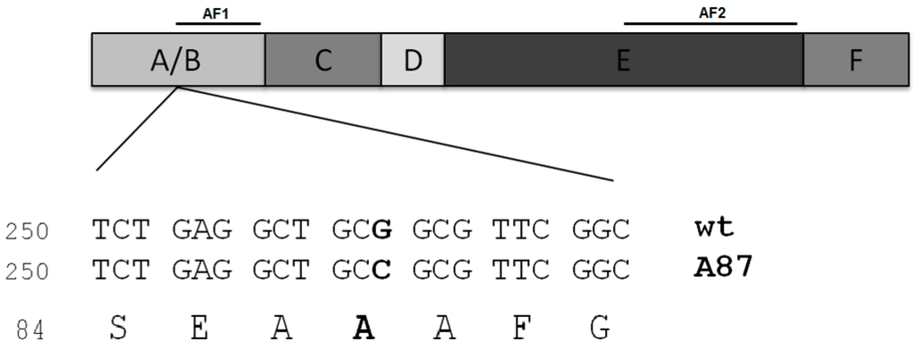 Representation of the human estrogen receptor alpha functional domains (A to F). The location of activation functions 1 and 2, AF1 and AF2, are shown (above). Below, Estrogen receptor alpha (ERWT) and silent polymorphism ERAla87 coding sequences and translated amino acids residues around Ala87 are indicated. The nucleotide change in Ala87 is shown in bold.