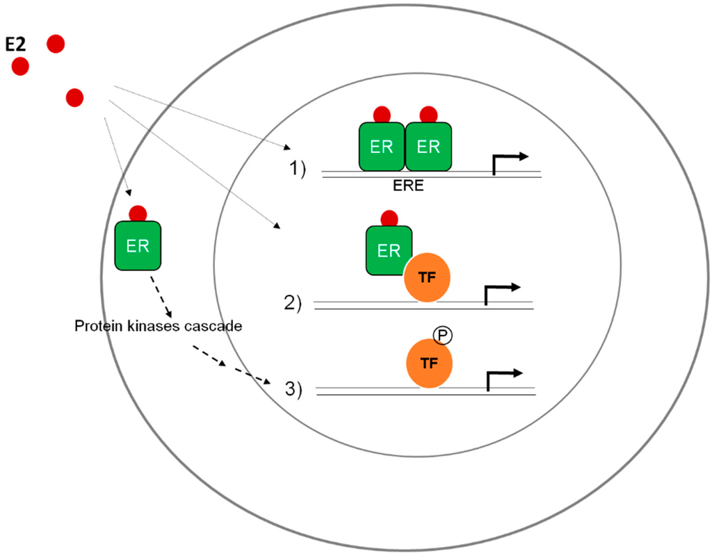 hERα mediates estrogen (E2) and other ligand effects through three main pathways. (1) The classical pathway, in which hERα binds directly to DNA, to estrogen-response elements (EREs); (2) The non-classical genomic pathway, where hERα interacts with other transcription factors (e.g., AP1 or Sp1) and regulates gene expression without directly binding to DNA; (3) The “non-genomic” mechanism, in which hERα modulates the activity of kinases that can regulate gene transcription and protein activity [19].