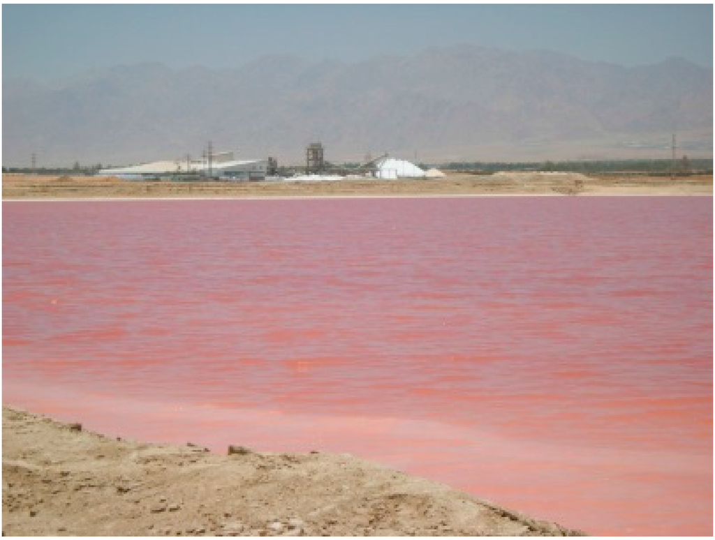 Thanks to the recent advances in the methodology of metagenomics and other cultivation-independent molecular methods used in microbial ecology we now have a fairly complete picture, qualitative as well as quantitative, of the microorganisms that inhabit the crystallizer ponds of solar salterns worldwide. The NaCl-saturated brines of crystallizer ponds are typically inhabited by a single primary producer, the unicellular alga Dunaliella salina (Chlorophyceae) [1], and by 107–108 prokaryotes/mL [2,3,4]. Most of these belong to the archaeal domain: Haloquadratum, Halorubrum, and other members of the class Halobacteria, but also some members of the Bacteria can be found, notably of the genus Salinibacter (Bacteroidetes) [5,6,7]. Most organisms inhabiting the brines are pigmented pink, red, or orange due to carotenoid pigments: primarily β-carotene in Dunaliella, α-bacterioruberin and derivatives in the Halobacteria, and salinixanthin in Salinibacter [8]. As a result, the waters of saltern crystallizers are generally colored brightly red-pink (Figure 1). Retinal-containing membrane-bound proteins such as bacteriorhodopsin and similar proton pumps in the Halobacteria and xanthorhodopsin in Salinibacter may also contribute to the pigmentation.