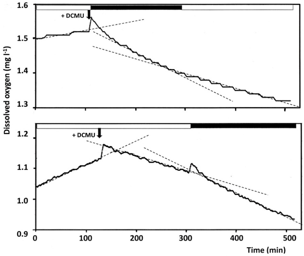 In experiments intended to assess the effect of light on the heterotrophic respiration of the community, photoautotrophic oxygen production by Dunaliella and any other phototrophs that may be present must be abolished. Therefore, the experiments were performed in the presence of 5 μM 3-(3-4-dichlorophenyl)-1,1-dimethylurea (DCMU), an inhibitor of photosynthetic electron transport at the acceptor side of photosystem II. Control experiments showed that DCMU at this concentration fully inhibits photosynthetic oxygen production by D. salina in the brine. The ethanol used to dissolve the inhibitor did not greatly affect dark respiration rates at the concentration added (17 mM), which is consistent with the fact that ethanol is not known as a preferred substrate for the growth of members of the Halobacteria [18].