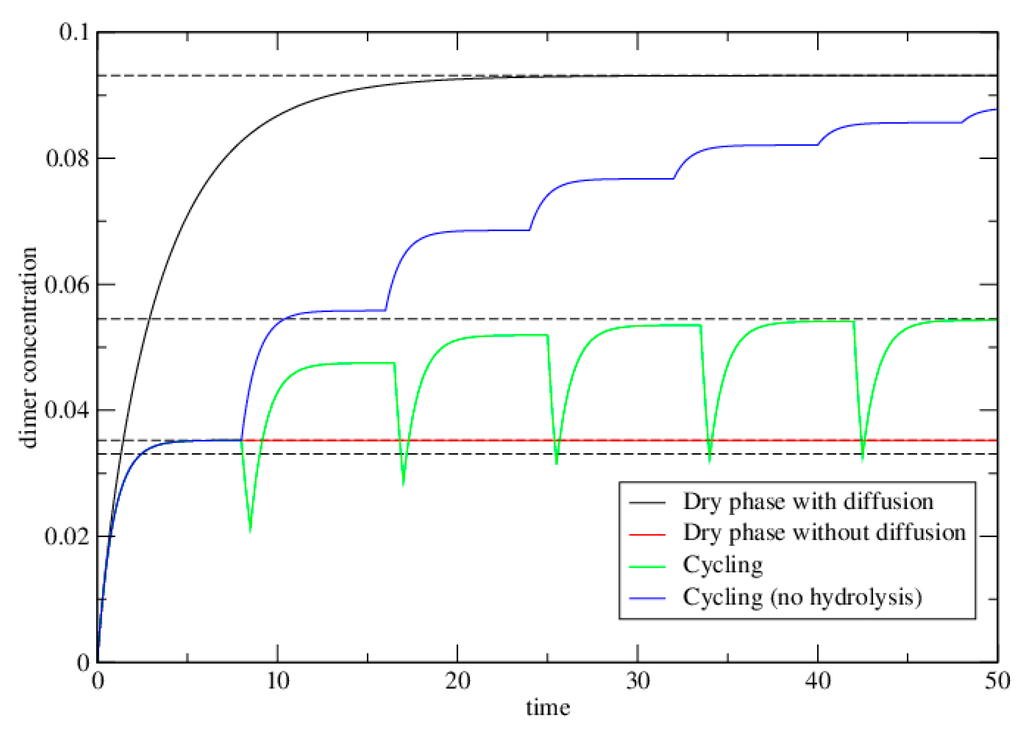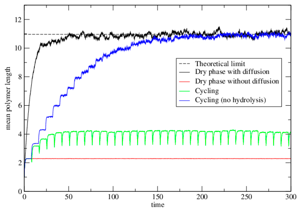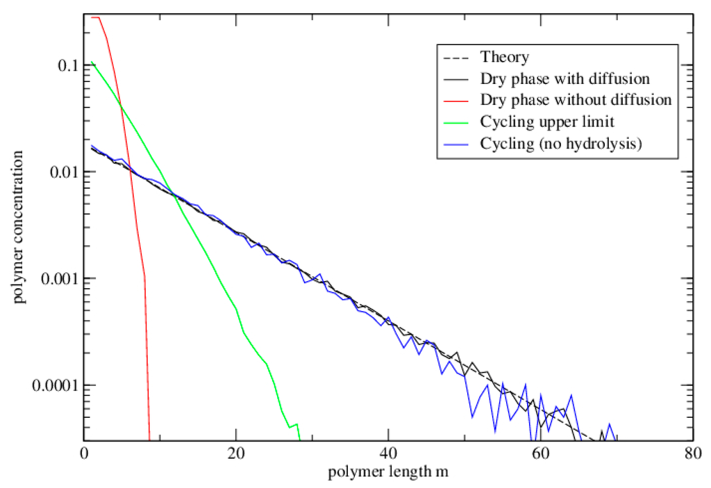 Figure 5 shows the equilibrium distribution of lengths in these simulations. The dashed line is the theoretical equilibrium solution for the well-mixed model. The simulations for the dry phase with diffusion, and for cycling with no hydrolysis both reach this theoretical limit. The length distribution for the single cycle without diffusion falls off much more rapidly than this. The distribution at the upper limit under cycling (at the end of the dry phase) is intermediate between these.