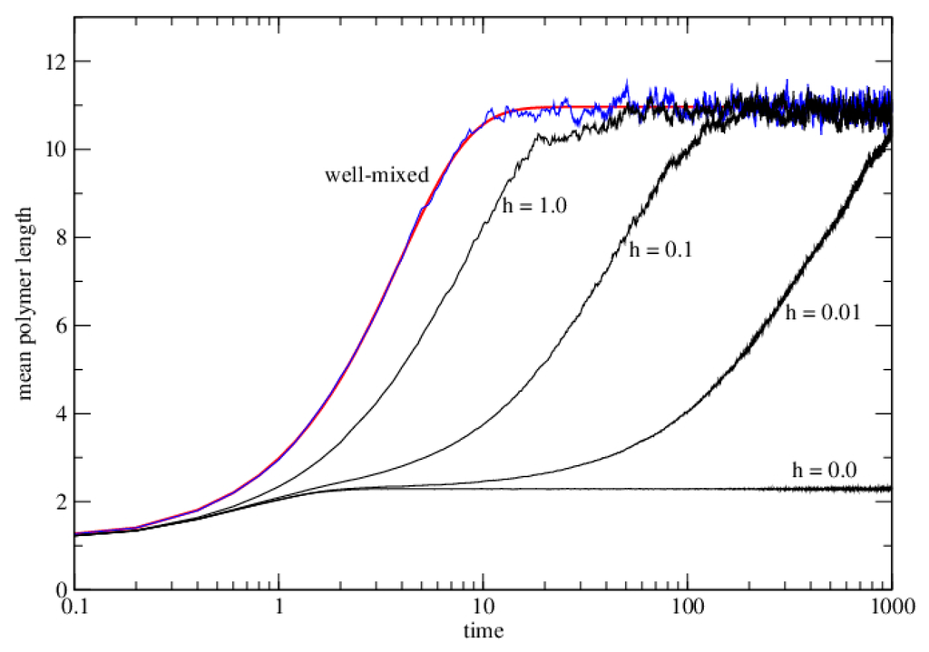 The importance of diffusion in models for the origin of life and replication has been noted before by several authors [27,28,29] and in our previous papers [10,11]. In all these papers, slow diffusion of replicating strands is beneficial because it allows the formation of clusters of cooperating replicators, which is an important means of resisting the invasion of parasites. However, the present paper discusses prebiotic polymerization prior to the existence of replicators, and the effect of diffusion is different here. Slow diffusion of monomers and oligomers is detrimental in the present paper because it slows down the reactions that form polymers.