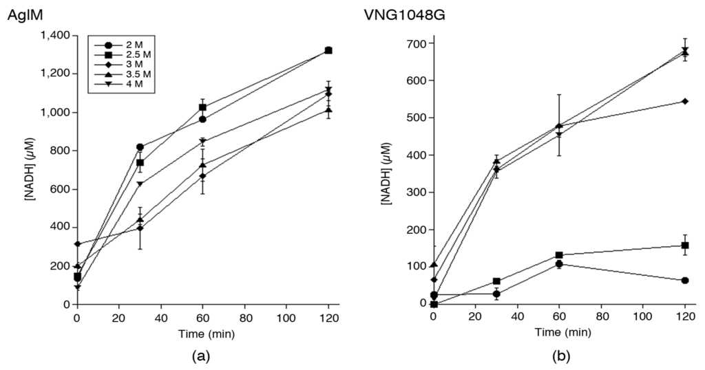 As a first step in characterizing Hfx. volcanii AglM and Hbt. salinarum VNG1048G, in vitro assays were conducted to assess the ability of each enzyme to catalyze the NAD+-dependent oxidation of UDP-glucose as a function of buffer salinity. Accordingly, each enzyme was engineered with a C-terminal C. thermocellum CBD tag that allows for cellulose-based purification in high salt surroundings [32] and expressed in Hfx. volcanii [25,26]. Cellulose-bound CBD-tagged AglM and VNG1048G were subsequently added to buffer containing 2, 2.5, 3, 3.5, or 4 M NaCl and the conversion of NAD+ to NADH was measured by spectrophotometrically determining absorbance at 340 nm over time. In this manner, distinct effects of salt concentration differences on the ability of the two enzymes to generate NADH were observed. Hfx. volcanii AglM generated similar amounts of NADH over time at each salt concentration tested, with the highest such activity been recorded in buffer containing 2 or 2.5 M NaCl. The amount of NADH generated by AglM did not substantially change as buffer salinity increased to 4 M NaCl (Figure 1a). By contrast, Hbt. salinarum VNG1048G showed the highest levels of NADH production in buffer containing 3.5 or 4 M NaCl. However, in buffer containing less than 3 M NaCl, only poor such VNG1048G activity was seen (Figure 1b). As such, whereas AglM is functional in the presence of 2–4 M NaCl, VNG1048G requires a milieu containing more than 2.5 M NaCl to display comparable activity.