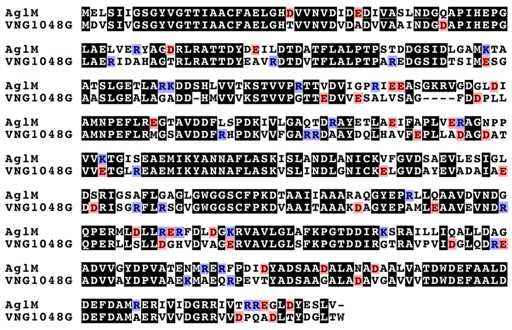 The amino acid sequences of Hbt. salinarum VNG1048G and Hfx. volcanii AglM were next compared to each other. Sequence alignment revealed that AglM and VNG1048G share 64% sequence identity over their entire lengths (Figure 3). Of the remaining residues, 30% showed substantial similarity, with Asp or Glu, Lys or Arg, Leu, Ile. Val or Met, Ser or Thr, or Ala or Gly being found at the corresponding positions in each protein. In the remaining 24% of the AglM and VNG1048G sequences, termed the protein-specific amino acid pool of each protein, it was noted that AglM presents 18 acidic and 21 basic residues, while VNG1048G presents 21 acidic and 13 basic residues. In other words, VNG1048G contains more acidic and fewer basic residues than does AglM. Further examination revealed that VNG1048G also presents more acidic residues at position occupied by basic residues in AglM than vice versa.