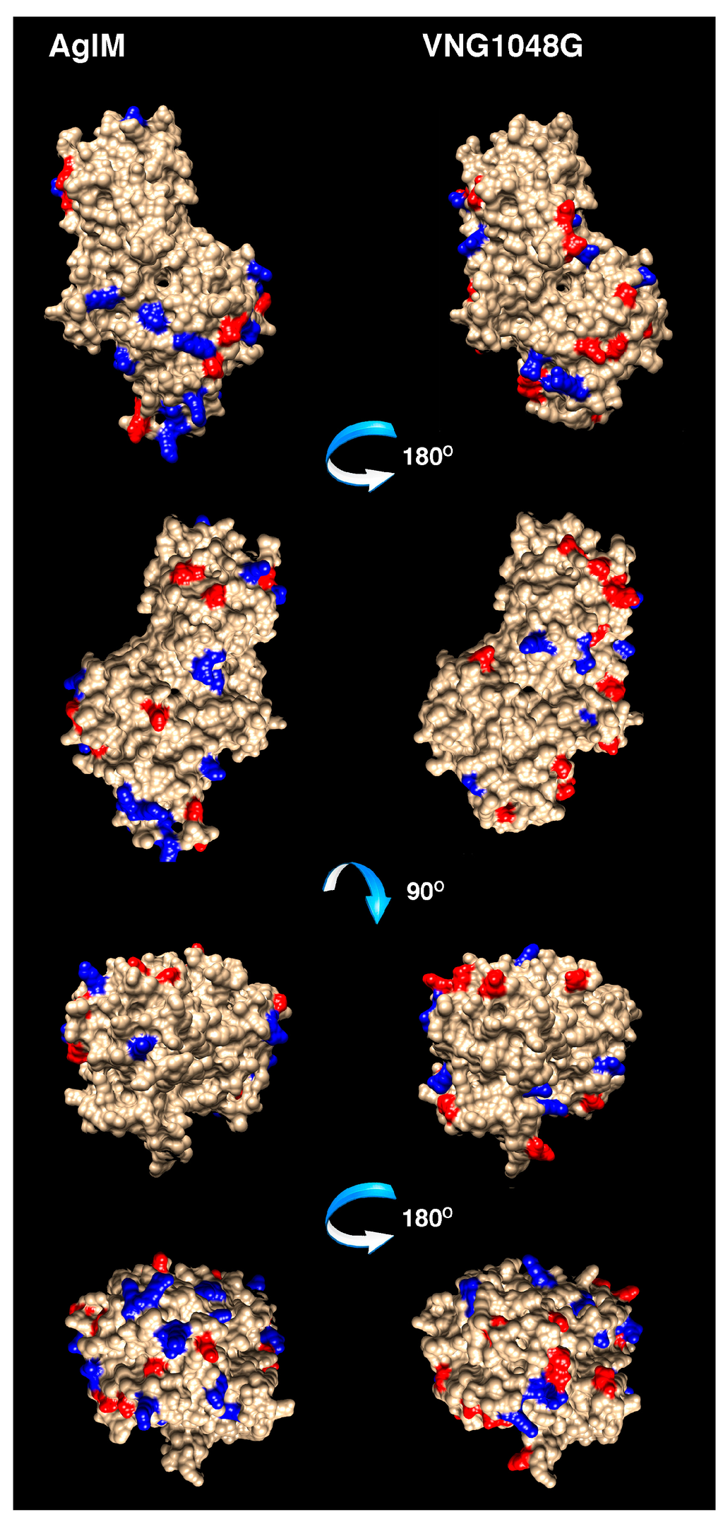 Figure 4. Homology models of AglM and VNG1048G. Homology models of AglM (left) and VNG1048G (right) were generated based on the solved crystal structure of human UDP-glucose dehydrogenase (PDB code 2Q3E). Shown are the front (top panels), back (panels second from top), top (panels third from top) and bottom (bottom panels) views of both models. Protein-specific acidic residues are colored in red, while protein-specific basic residues are colored in blue.