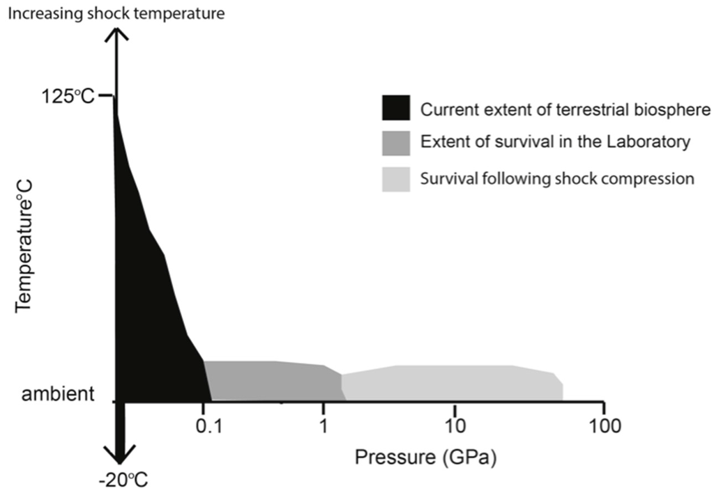 - Burchell, M.J.; Mann, J.R.; Bunch, A.W. Survival of bacteria and spores under extreme shock pressures. Mon. Not. R. Astron. Soc. 2004, 1278, 1273–1278. [Google Scholar] [CrossRef]