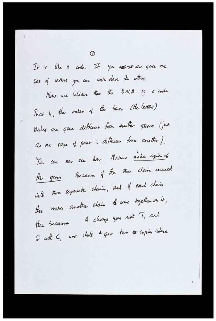 “…Now we believe that the D.N.A. is a code. That is, the order of the bases (the letters) makes one gene different from another gene (just as one page of print is different from another). You can now see how Nature makes copies of the genes. Because if the two chains unwind into two separate chains, and if each chain then makes another chain come together on it, then because A always goes with T, and G with C, we shall get two copies where…”(Figure 2).