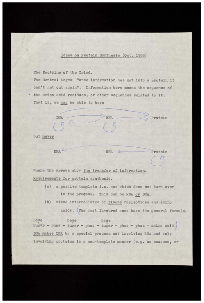 The earliest written description of “The Central Dogma” in a manuscript entitled “Ideas on protein synthesis (October 1956)”. Credit: Wellcome Library, London.