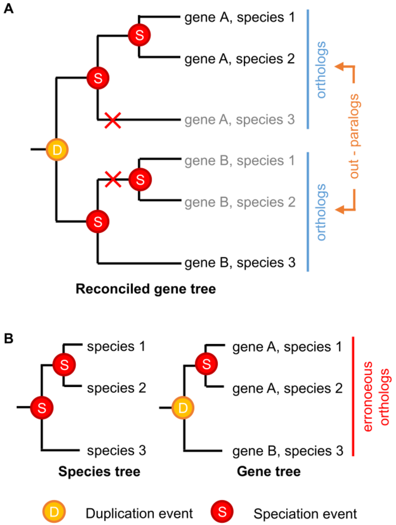 Differential gene loss can obscure the identification of paralogous genes. (A) A hypothetical example showing the historical evolutionary history of a simple multigene family across three species. Gene duplication and speciation events are indicated, with red crosses indicating gene losses. Grey names indicate unobservable “extinct” genes; (B) Even if the correct species tree were known with certainty, differential loss of paralogs across the species in (A) would result in the indicated gene tree, which is “correct,” given extant sequence data, but cannot observe the “extinct” genes. Gene-species tree reconciliation results in the erroneous grouping of paralogous genes A and B as orthologs.