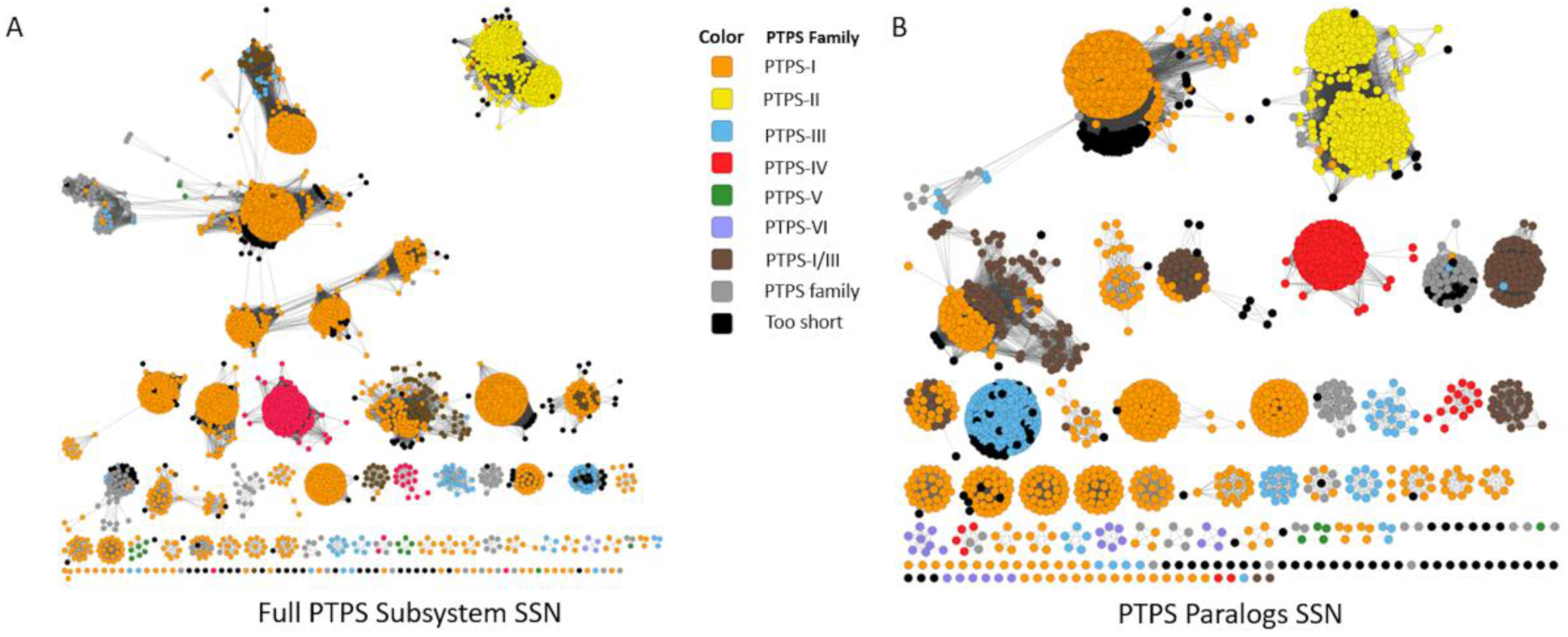 Sequence Similarity Networks Generated from the “PTPS paralog” Subsystem. An SSN was generated from the sequences extracted from the “PTPS paralog” subsystem, at alignment score threshold of 30 (A); A specific subset of sequences, limited to only to PTPS homologs in the same genomes (paralogs), were used to generate an SSN with identical parameters (B).