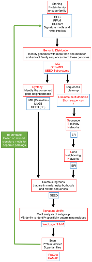 None of the automated functional annotation pipelines were able to correctly separate COG0720 paralogs, whereas these paralogs were easily identified manually using comparative genomic tools. This suggests that an automated workflow inspired by our manual annotation strategy might be appropriate for separating challenging paralog groups (Figure 5). The key idea in this workflow is to focus initial analyses only on those genomes in which paralogs can be easily identified. Simply, any single genome containing at least two members of a protein family must encode paralogs, although the paralogs could perform the same or different functions. Once paralogs have been identified in a single genome, physical clustering by gene neighborhood can be used to group paralogs likely to have similar functions—because they physically group with the same genes across different genomes—and separate paralogs likely to have different functions—because they cluster with different groups of genes across genomes. Patterns of sequence conservation within and among paralog groups can then be used to identify “signature sequence motifs” that reliably identify the group of paralogs performing each functional role (Figure 1).