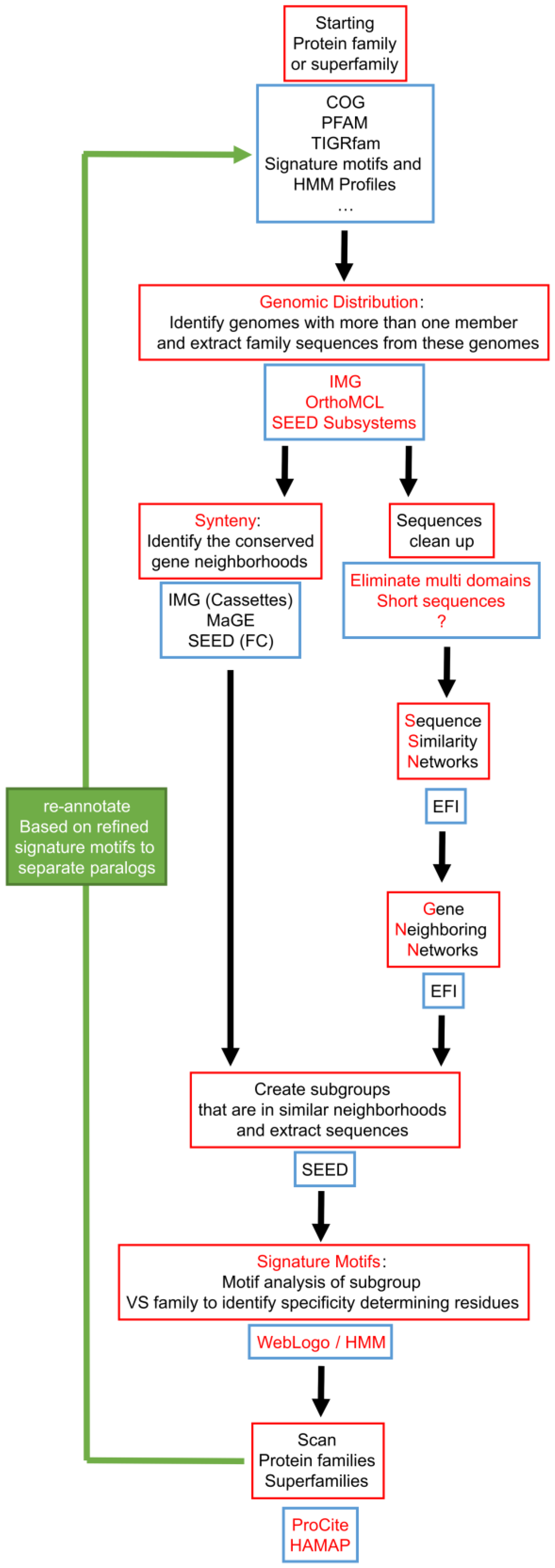 Proposed workflow for improving paralog annotation that integrates existing tools. The key features of this workflow are: focusing on genomes that already have paralogs, and building signature motifs only on groups of sequences that share similar physical neighborhoods. Red boxes describe the different required operations, and blue boxes list existing databases or software that provide the tools to perform these operations. The use of SSN and GNN is proposed as a strategy to identify the groups of sequences to build signatures as we feel their pipeline could become more automatable once it has matured. FC: Functionally coupled.