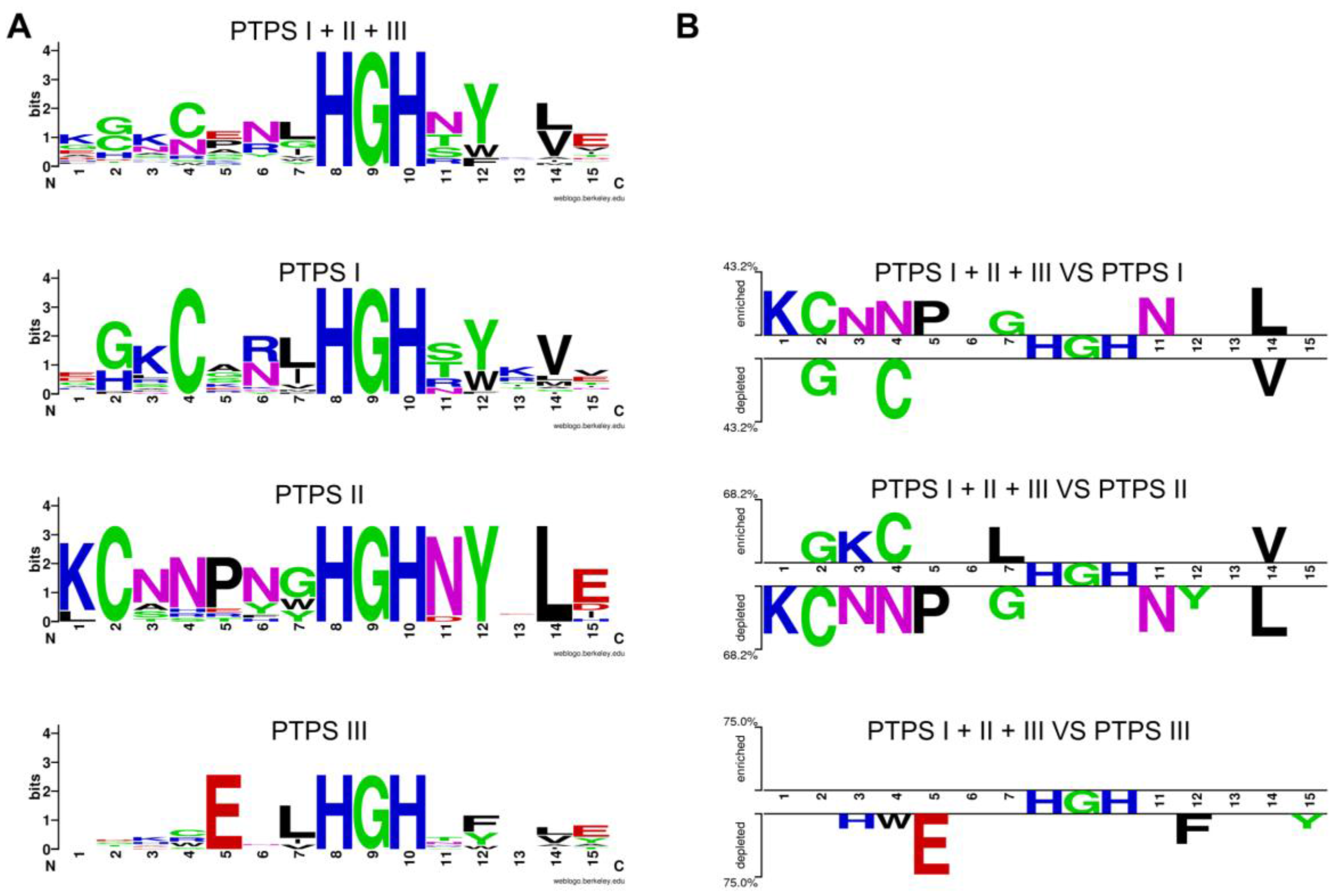 For sequence logo analysis and comparison, selected sequences corresponding to PTPS-I, II and III were extracted from the “PTPS paralogs subsystem” from genomes for which there is more than one PTPS (and are defined as paralogs) and for which there is evidence of functional coupling with genes previously identified involved in the specific PTPS pathway. Sequences were aligned with Clustal Ω [177]. Obtained alignments were trimmed with AliView-1.17.1 [179] to focus on the conserved motif area. The reference for the comparison contains all the extracted sequences and is used as a representative for the PTPS family. From the alignment, WebLogo [172] was used to create logos of the HGH motif region. Each logo was compared with the others in Two Sample Logo using the t-test option [173]. The sequences extracted are available in document S1.