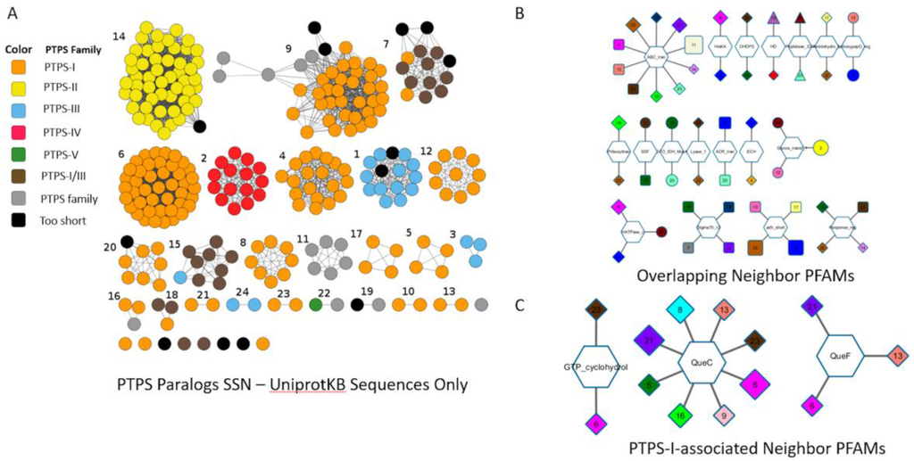Genome Neighborhood Network (GNN) generated from the “PTPS paralog” subsystem. A Sequence Similarity Network was generated with the COG0720 proteins extracted from the “PTPS paralog” subsystem, but only from genomes that harbored several proteins of the family and that could be mapped to an Uniprot ID (A); The alignment score threshold was 25. Each SSN cluster is identified with a unique number. To create the GNN (B), the neighboring (10) genes of each gene in a given cluster are captured as a PFAM ID. The hexagonal inside nodes are these PFAMs and the external nodes represent the clusters that have this PFAM in their neighborhoods. Broad PFAM families such as ABC transporters (ABC-trans) or Histidine kinase (HisKA) are linked to clusters that belong to different subfamilies introducing background noise that make a blind analysis difficult. When looking at PFAMs associated with PTPS-I clusters (C), relevant neighbors such as QueC, QueF and FolE (PFAM name: GTP_CyclohydroI) are identified. However, not all PTPS-I clusters are present: the clusters 4, 12, 20, 17, 16, and 10 are missing.