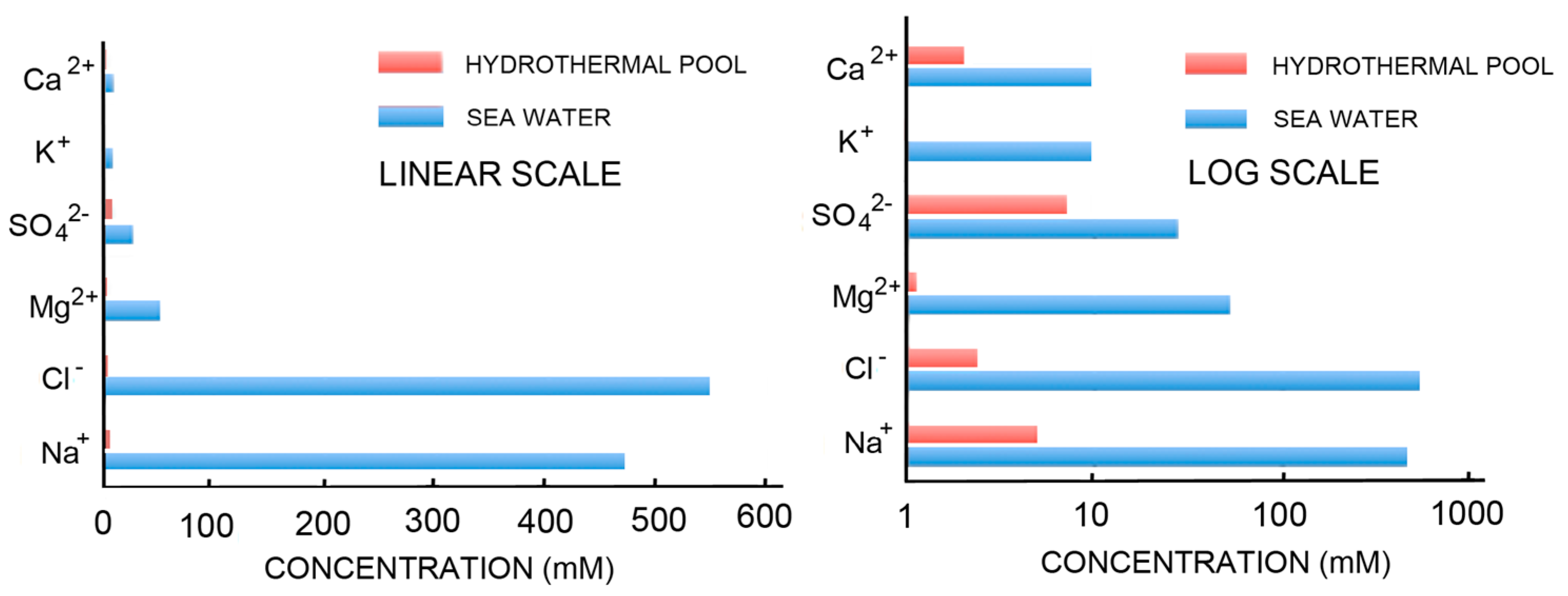 The simplest way to avoid the problems associated with concentrating potential reactants and inhibition of self-assembly by the divalent cations of seawater is to consider that the first cells may have originated in fresh water associated with volcanic land masses. Figure 2 compares the ionic components of seawater and hydrothermal fields [67] on both linear and log scales. The ionic solutes of hydrothermal water barely register on the linear scale that is dominated by the salt composition of seawater. The log scale shows hydrothermal ionic concentrations in the millimolar range while seawater today is 0.6 M Na+, 54 mM Mg2+ and 10 mM Ca2+.