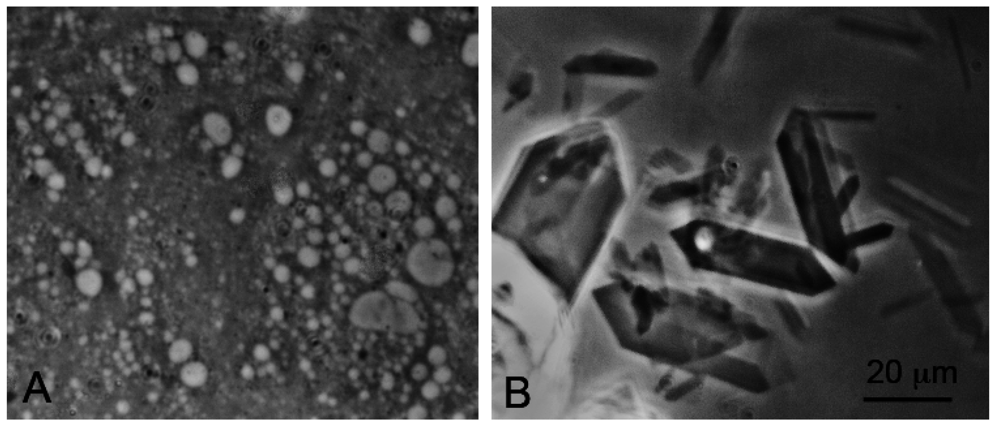 Self-assembly of anionic amphiphiles into membranous vesicles is strongly inhibited by the divalent cation concentrations in this range but readily occurs in dilute ionic concentrations. Figure 3 shows fatty acid membranes composed of 50 mM decanoic acid at pH 8.3 in a 20-fold dilution of sea water (25 mM NaCl, 2.7 mM MgCl2 and 0.5 mM CaCl2, Figure 3A) and in undiluted sea water (Figure 3B). Decanoic acid readily forms membranous vesicles in the diluted seawater simulating the ionic composition that might be present in a hydrothermal pool. However, in seawater the divalent cations present cause the decanoic acid to precipitate as crystals and aggregates of Ca2+/Mg2+ decanoate, making it impossible for membranes to form. Although fatty acids are strongly affected by divalent cations, amphiphiles such as alcohols and monoglycerides do not interact with cations. Monnard et al. [68] showed that adding these as components allowed membranous vesicles to form in seawater.