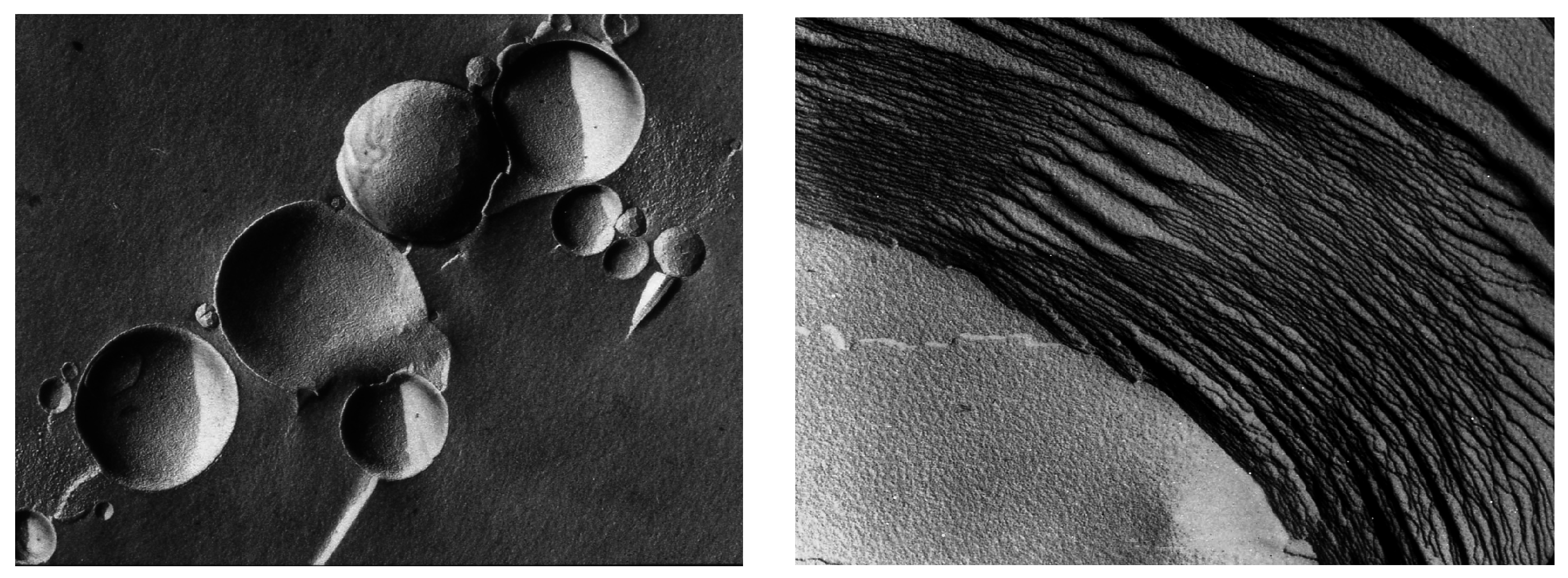 Vesicular membranes 1–10 μm in diameter self-assemble from amphiphilic molecules like phospholipids, as shown in the freeze-fracture image (left panel). When dried, the vesicles fuse and flatten to form multilamellar structures (right panel). Each of the layers is the dimension of a single lipid bilayer ~5 nm thick. In the freeze-fracture method, lipid bilayers are split within the plane of the hydrocarbon chains, not along the head groups.