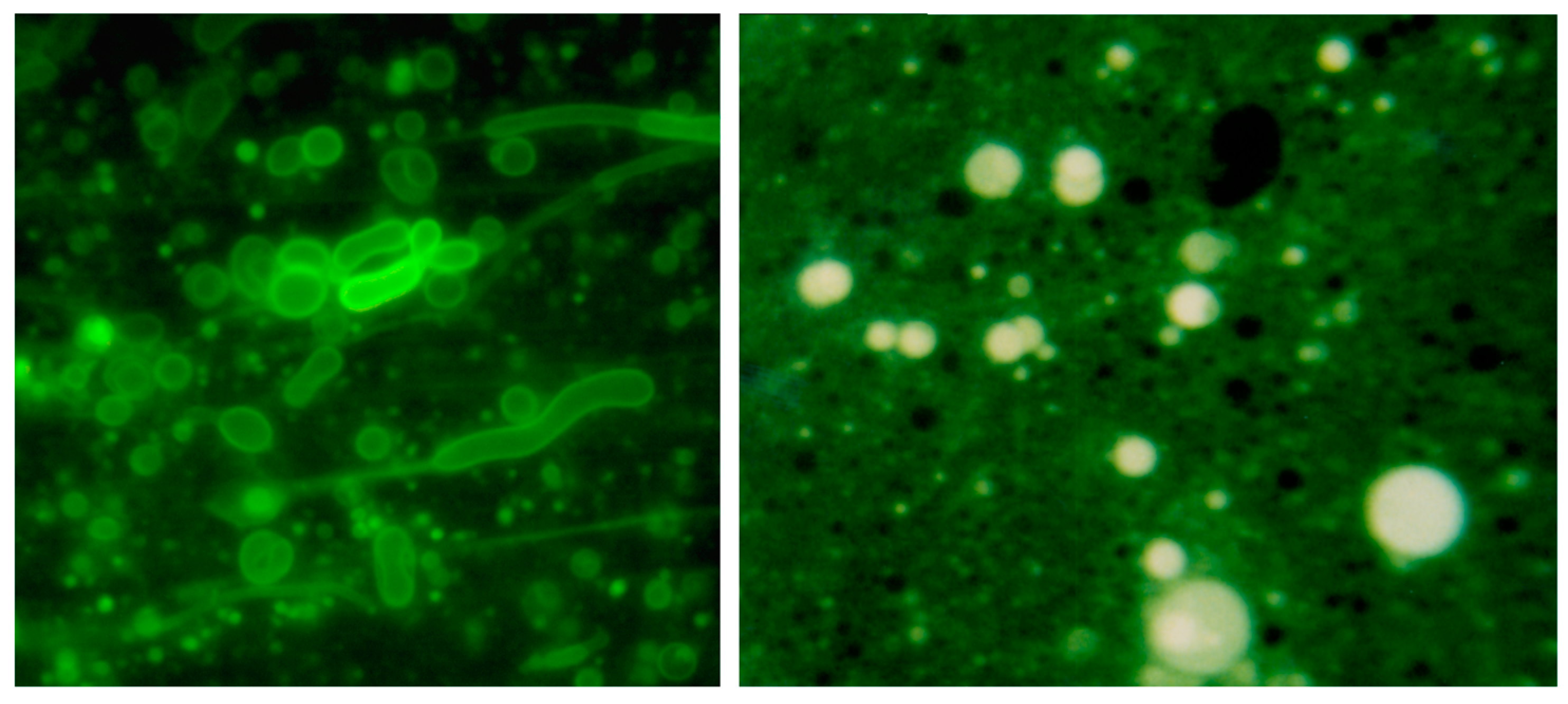 Membranous vesicles self-assemble from mixtures of fatty acids and alcohols such as decanoic acid and 1-decanol [61]. The vesicles shown here (left panel) were stained with rhodamine 6G and photographed by fluorescence microscopy (400× original magnification) [68]. Typical vesicles shown in the micrograph are ~1–10 μm in diameter. After a single dehydration cycle (right panel), the vesicles readily encapsulated macromolecules such as ~600 nt duplex DNA. The DNA was stained with acridine orange, an intercalating fluorescent dye.