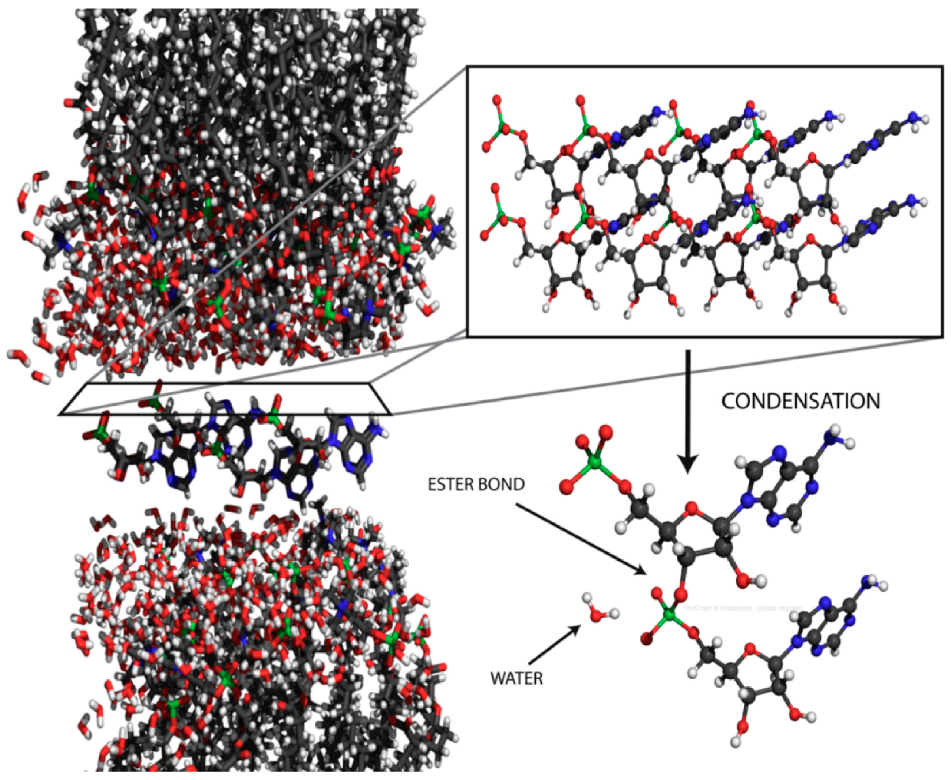- De Guzman, V.; Shenasa, H.; Vercoutere, W.; Deamer, D. Generation of oligonucleotides under hydrothermal conditions by non-enzymatic polymerization. J. Mol. Evol. 2014, 78, 251–262. [Google Scholar] [CrossRef] [PubMed]