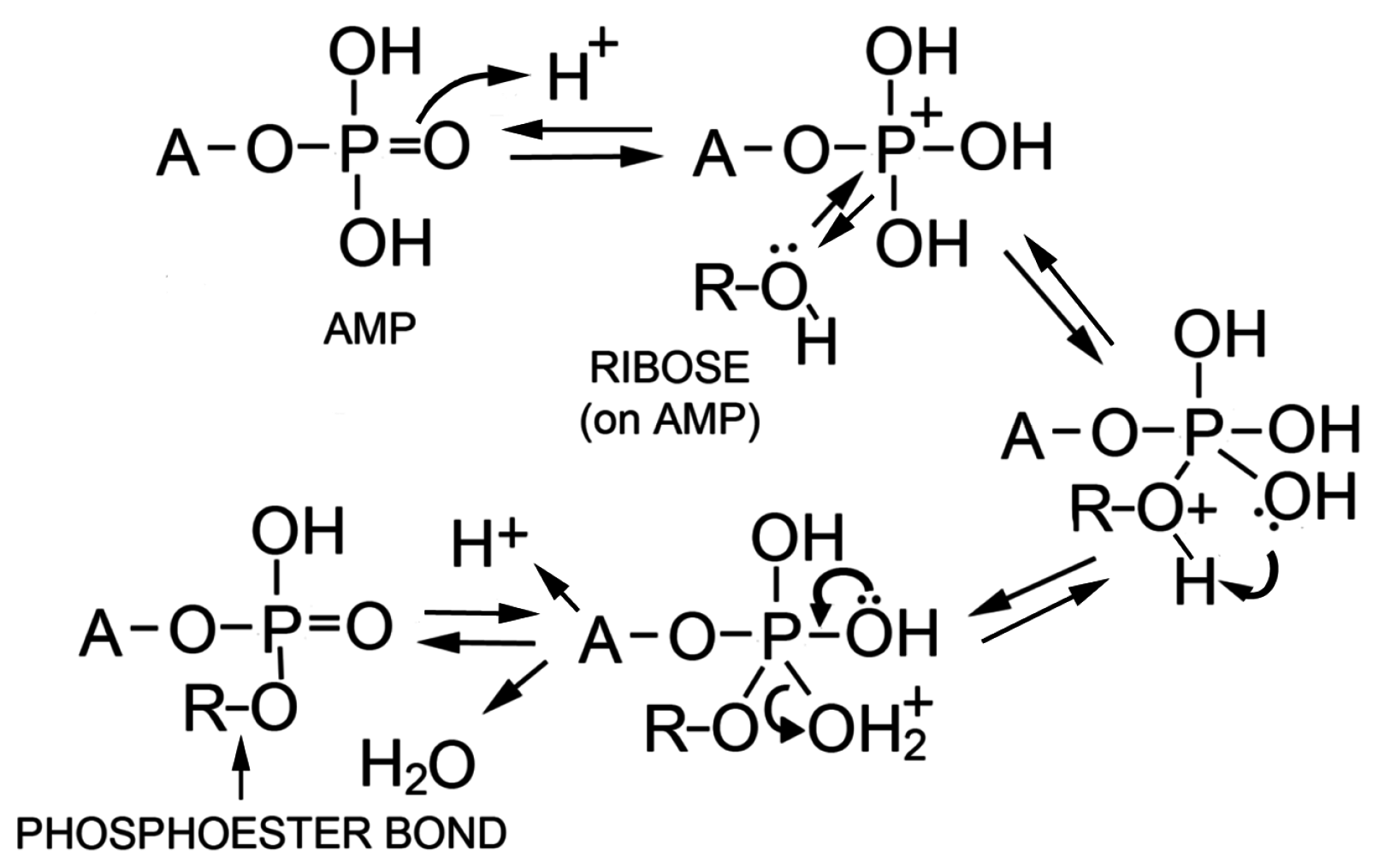The authors concluded that polymers resembling nucleic acid oligomers are synthesized by wet-dry cycles as long as they were dehydrated in the presence of a promoter such as multilamellar liquid crystals or eutectic mixtures associated with crystallizing monovalent salts. Although the precise mechanism is not yet understood, one possibility is that at low pH a phosphoryl oxygen (P=O) group on the phosphate becomes protonated to -OH+ which then passes through several intermediate states shown in Figure 7. The 2′ or 3′ hydroxyl of a neighboring ribose then can undergo a nucleophilic attack on the phosphorus to produce an ester bond when a water molecule becomes a leaving group. The moderately elevated temperature of 60–90 °C provides activation energy for the reaction without significant degradation of reactants or products. Significantly, if amphiphilic compounds are present during dehydration, the polymer products that are synthesized become encapsulated upon rehydration.