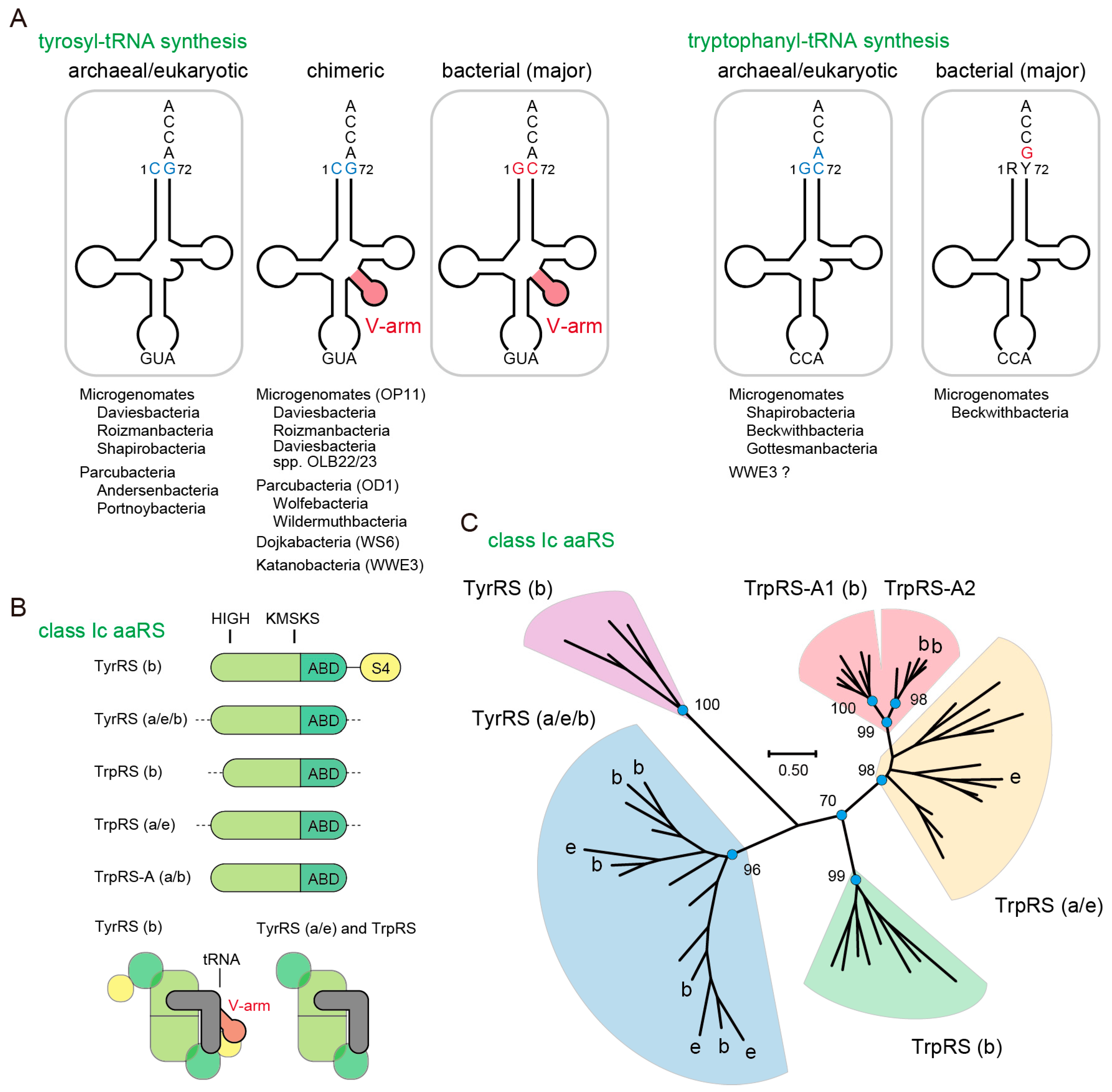 Bacteria with an archaeal tRNATyr or tRNATrp identity. (A) The major identity elements for tyrosyl-tRNA synthetase (TyrRS) and tryptophanyl-tRNA synthetase (TrpRS) are shown in blue and red. Diverse subgroups of the Candidate Phyla Radiation (CPR) have archaea-like tRNATyr and tRNATrp genes, as shown below the tRNA structures. Ca. Beckwithbacteria bacterium RBG_13_42_9 has both bacterial and archaeal pairs of TrpRS•tRNATrp; (B) Domain structures of the class Ic aminoacyl-tRNA synthetase (aaRS) family (homodimer). The S4-like domain binds to the V-arm of bacterial tRNATyr. ABD denotes anticodon-binding domain. TrpRS-A is a newly identified TrpRS homolog. Class Ic aaRS is known to form a homodimer (in a few cases pseudo-homodimer) and binds to one tRNA molecule at a time (half-of-the-sites). Bacterial, archaeal and eukaryotic origins are indicated with b, a and e, respectively; (C) Phylogenetic analysis of the class Ic aaRS family. Maximum likelihood bootstrap values (100 replicates) are shown. The TrpRS-A species are split into two clades. The TrpRS-A2 proteins may chelate a [4Fe–4S] cluster.
