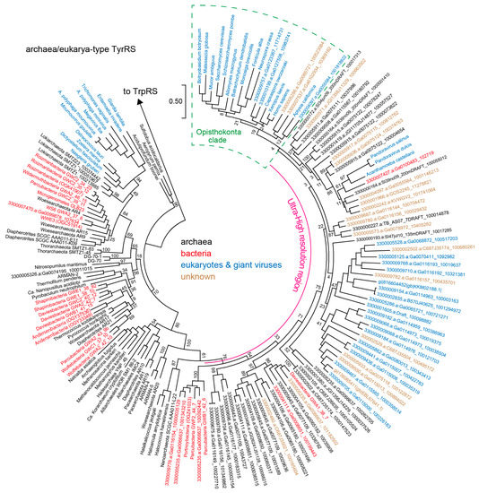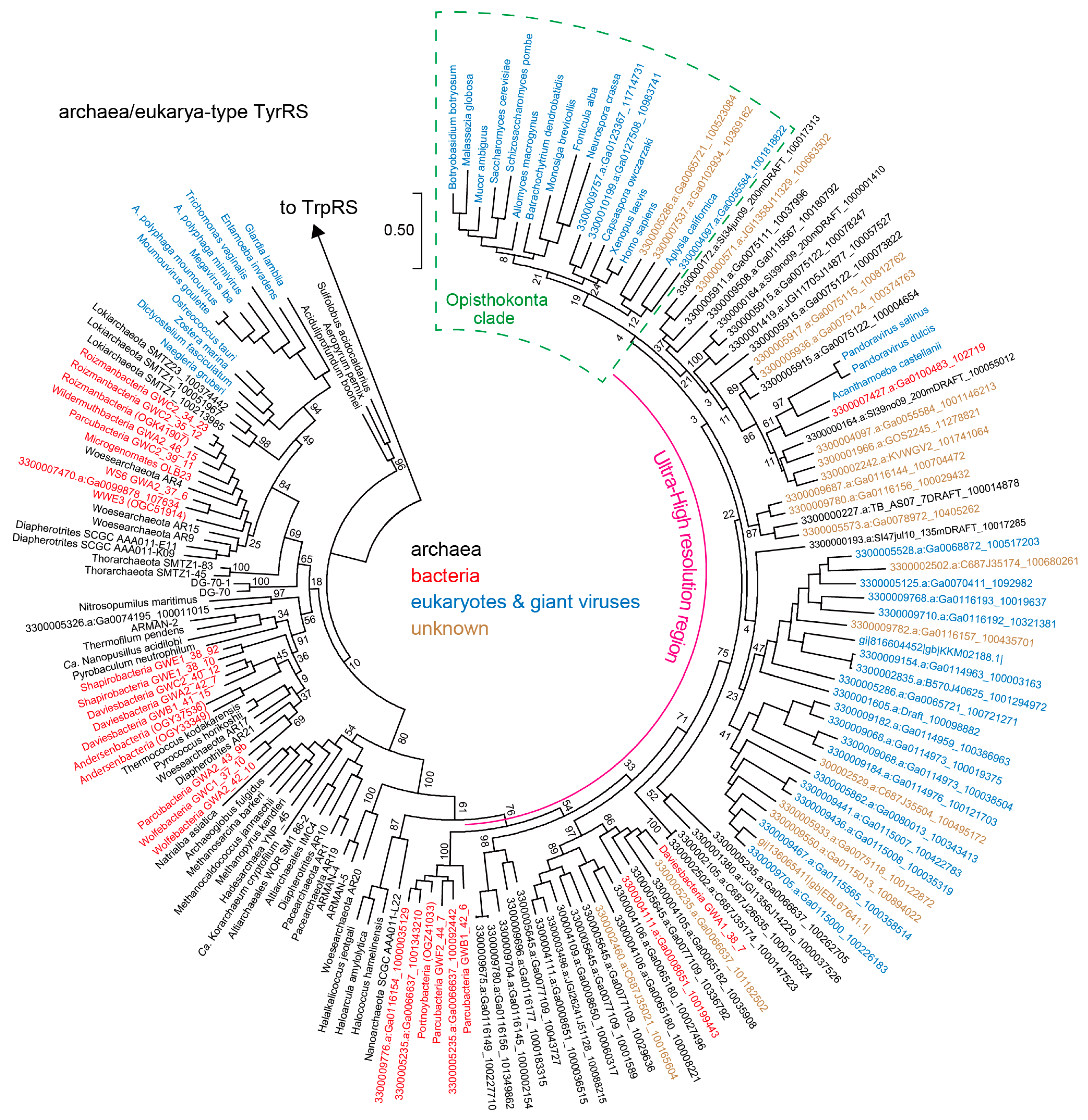 A phylogenetic tree for archaea/eukarya-type TyrRS. Bootstrap values (%) are shown for the rooted Maximum Likelihood tree made with 100 replicates using MEGA7. The ‘Ultra-High resolution’ region shows almost all TyrRS sequences identified by the comprehensive genome/metagenome/metatranscriptome analysis using gi|816604452|gb|KKM02188.1| as query for BLASTp. The archaeal species in the Ultra-High resolution region may belong to the DPANN superphylum according to the Joint Genome Institute’s annotation pipeline and our manual annotation. The opisthokontal (fungal and animal) TyrRS clade is marked with a green box. We chose a few representative TyrRS sequences for each major bacterial group (Roizmanbacteria, Daviesbacteria, Shapirobacteria, Wolfebacteria and Andersenbacteria) after confirming the sequence similarity within the same group. In contrast, we identified three orphan TyrRS genes belonging to bacteria in the Ultra-High resolution region. TrpRS sequences of Thermus thermophilus (bacteria) and Pyrococcus horikoshii (archaea) were used as an outgroup.