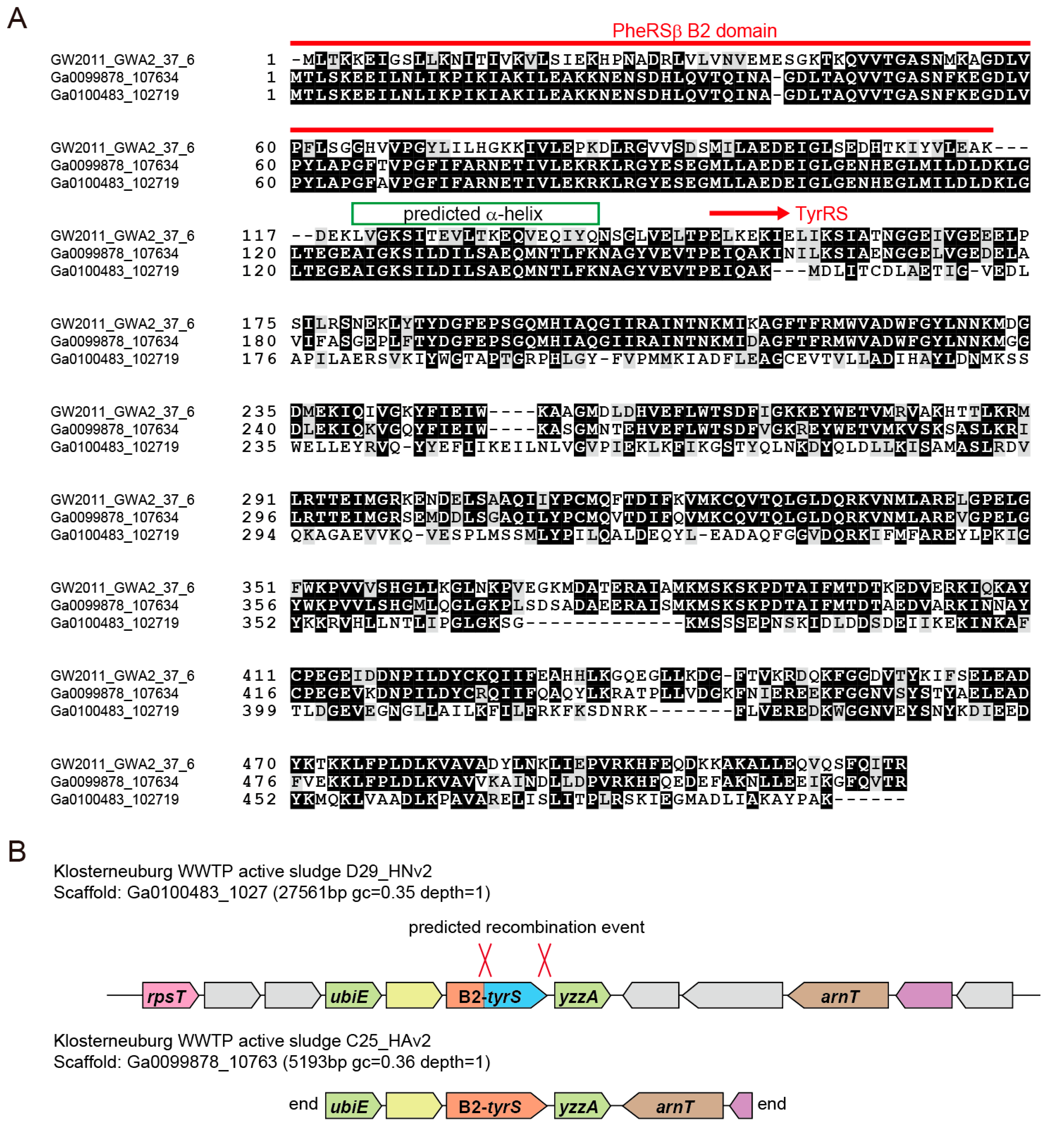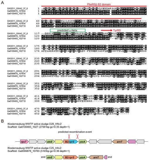 The TyrRS species with a N-terminal B2 domain fusion. (A) Multiple sequence alignment of the three B2-TyrRS proteins; (B) The genomic loci of the two B2-TyrRS genes in active sludge metagenomes. Predicted recombination sites are indicated.