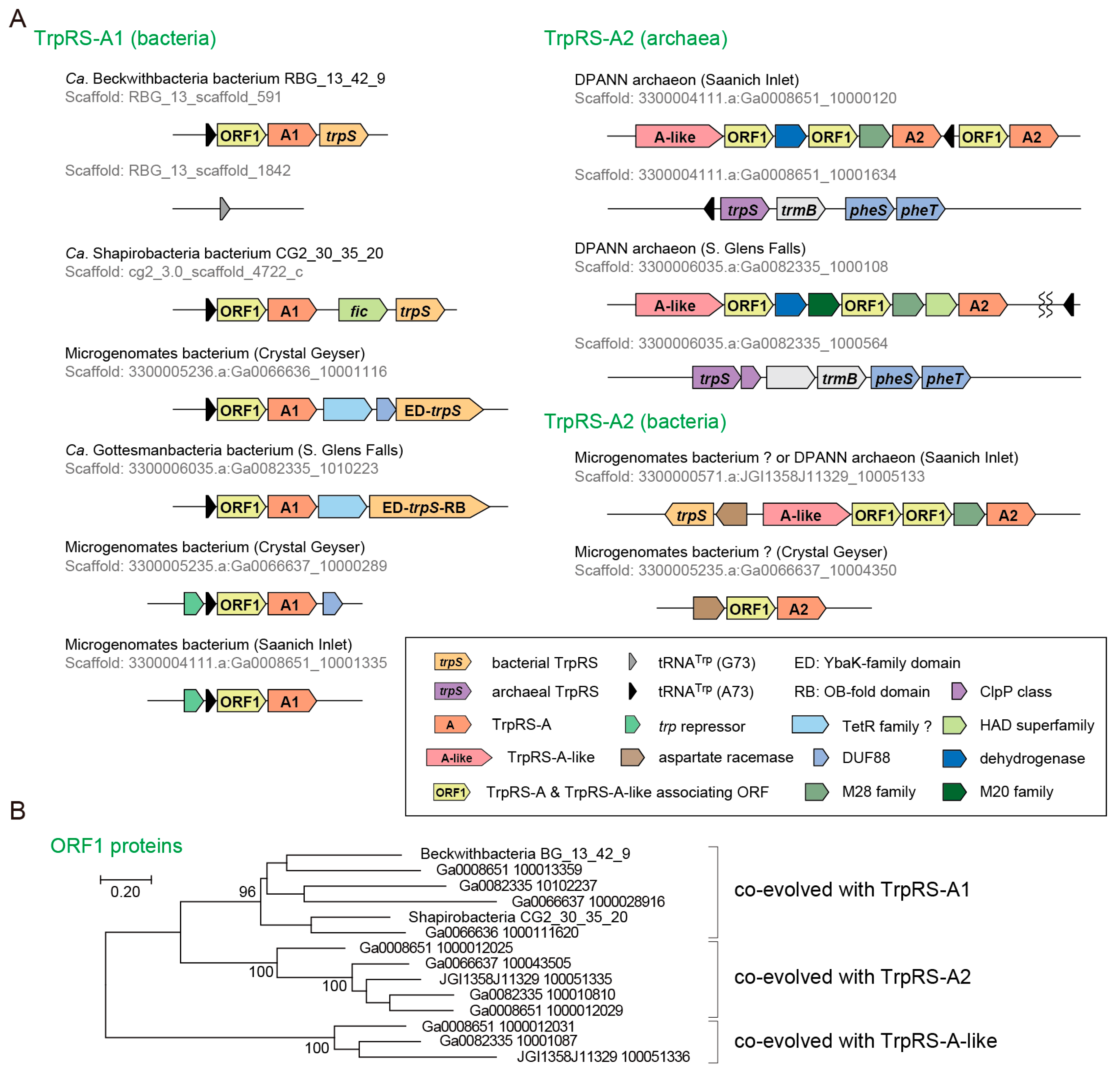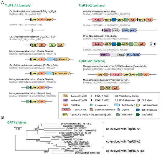 Non-canonical TrpRS species. (A) The genetic loci and the operon structures of TrpRS-A genes. The origins of these uncultured organisms are described in the parentheses and indicated with “CG” (Crystal Geyser groundwater) and “RBG” (Rifle BackGround groundwater). In a few Microgenomates species, TrpRS is fused with small proteins; (B) Co-evolution of the ORF1 genes with the TrpRS-A and TrpRS-A-like genes. Bootstrap values (%) are shown for the unrooted Maximum Likelihood tree made with 100 replicates using MEGA7.