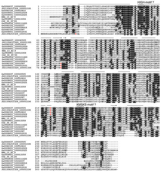 - Larkin, M.A.; Blackshields, G.; Brown, N.P.; Chenna, R.; McGettigan, P.A.; McWilliam, H.; Valentin, F.; Wallace, I.M.; Wilm, A.; Lopez, R.; et al. Clustal W and Clustal X version 2.0. Bioinformatics 2007, 23, 2947–2948. [Google Scholar] [CrossRef] [PubMed]