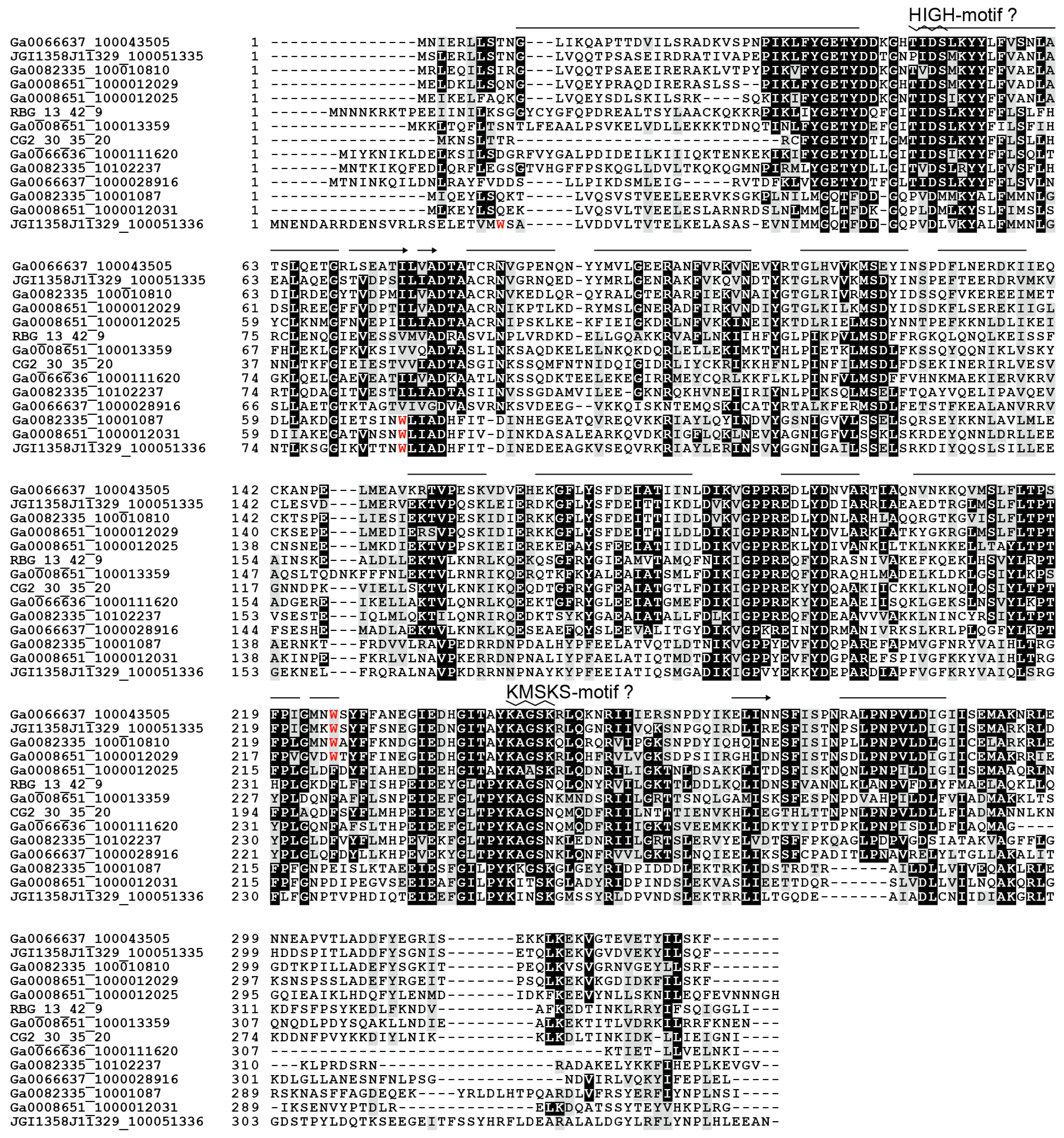 Multiple pairwise alignment of the ORF1 proteins and their structural prediction by SWISS-MODEL. Bars and arrows above the amino acid sequences represent predicted α-helices and β-strands, respectively, whereas zigzags indicate predicted HIGH and KMSKS motifs. The predicted overall structure suggests that the ORF1 protein might be a homolog of class I aaRS. Tryptophan (W) residues are shown as red letters.