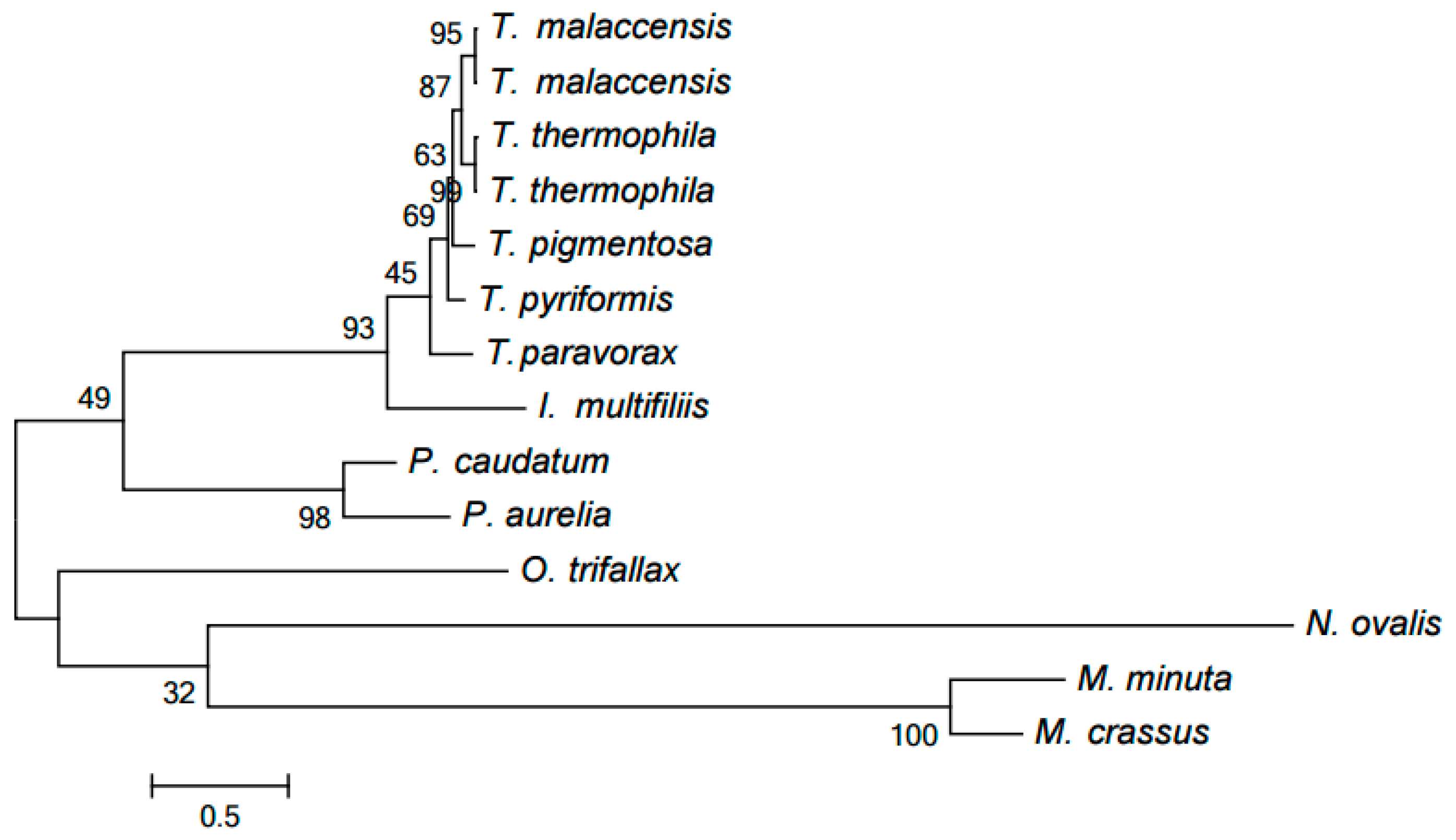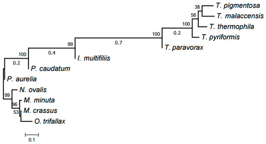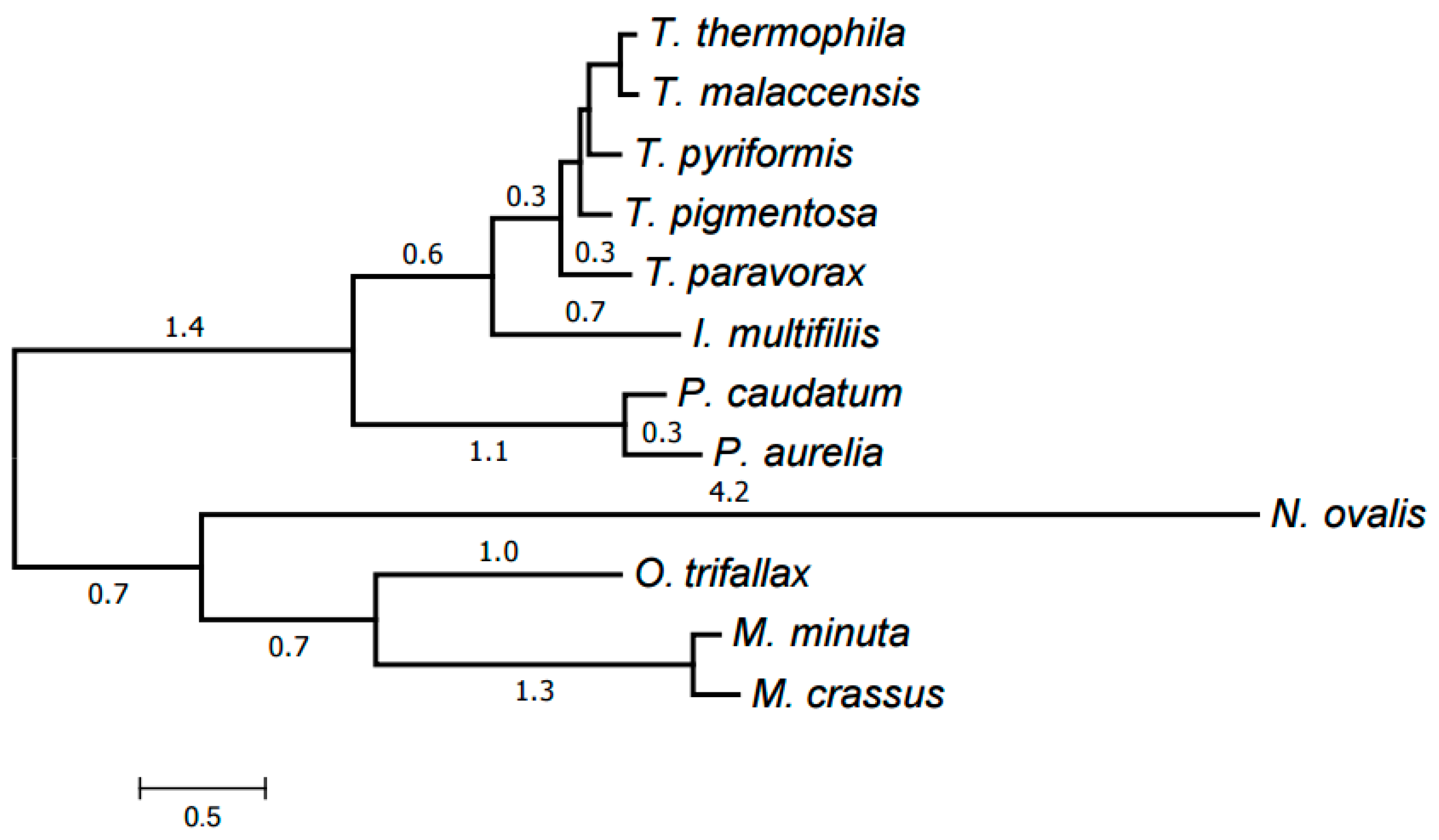 Complete mitochondrial genomes were extracted from GenBank for the following species: Ichthyophthirius multifiliis (NC_015981), Paramecium aurelia (NC_001324), P. caudatum (NC_014262), Tetrahymena malaccensis (NC_008337), T. paravorax (NC_008338), T. pigmentosa (NC_008339), T. pyriformis (NC_000862), and T. thermophila (NC_003029). The same source was used to extract four incomplete mitochondrial genomes of Moneuplotes minuta (GQ903130), M. crassus (GQ903131), Nyctotherus ovalis (GU057832), and Oxytricha trifallax (Sterkiella histriomuscorum; JN383843).
