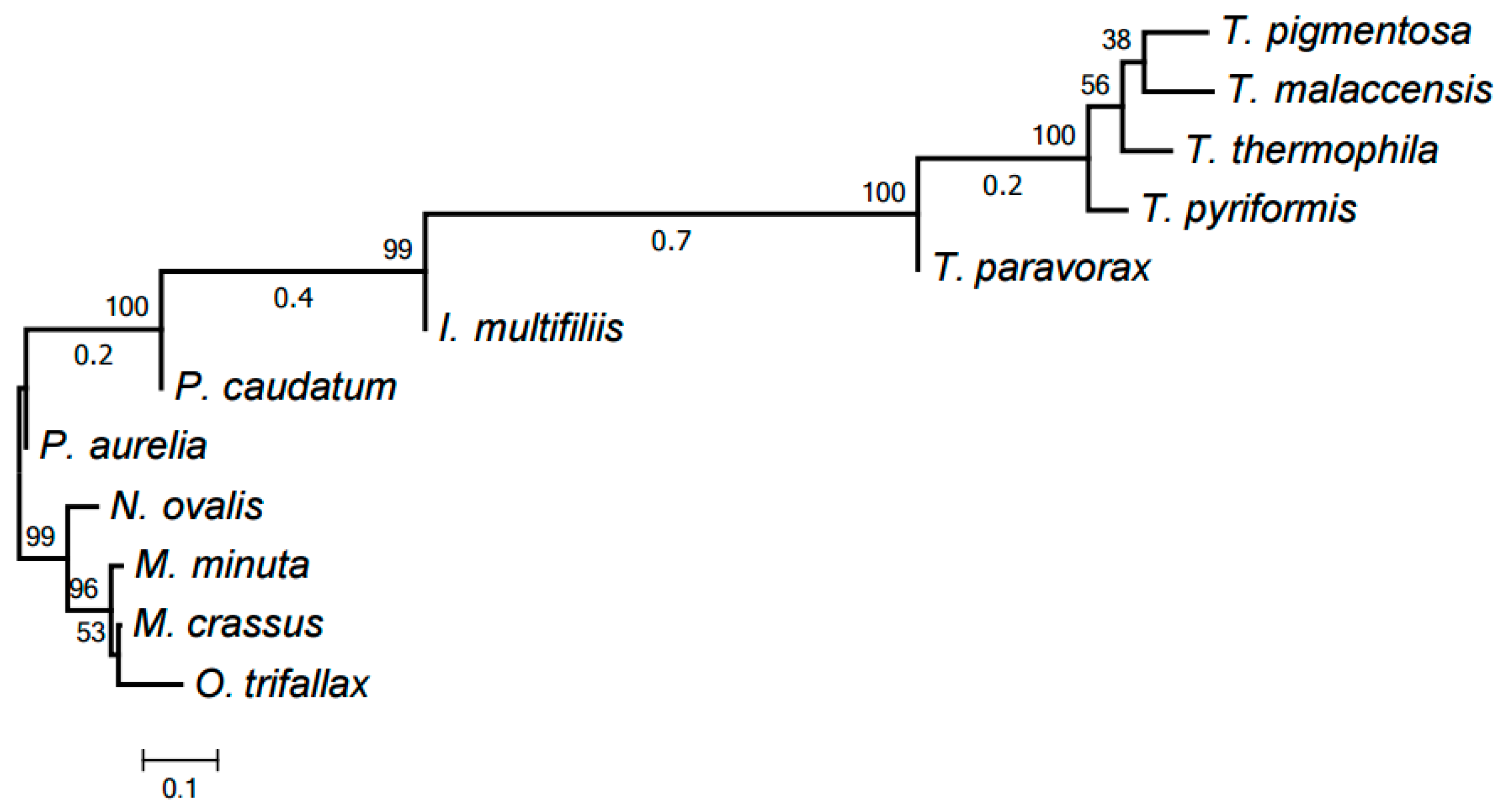 - Burger, G.; Zhu, Y.; Littlejohn, T.G.; Greenwood, S.J.; Schnare, M.N.; Lang, B.F.; Gray, M.W. Complete sequence of the mitochondrial genome of Tetrahymena pyriformis and comparison with Paramecium aurelia mitochondrial DNA. J. Mol. Biol. 2000, 297, 365–380. [Google Scholar] [CrossRef] [PubMed]