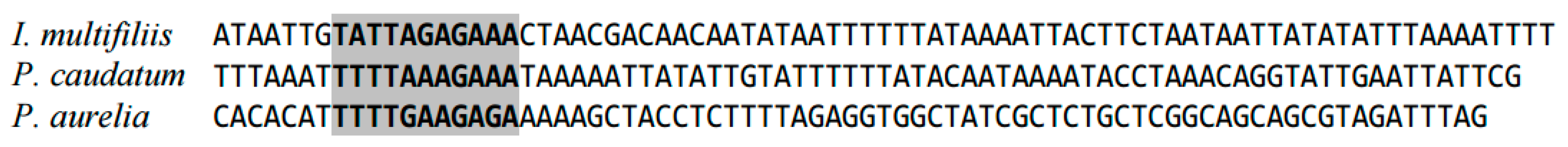 Figure 2 shows the alignment of the 5′-leader sequences upstream of the cob gene in Ichthyophthirius multifiliis and Paramecium spp. The conserved region with low similarity to plant mitochondrial promoters is marked in grey; however, this region contains no YRTA site typical for such promoters [21]. The cob gene in these species is surrounded with other genes in the same DNA strand; however, the 5′-intergenic region of cob is relatively long.