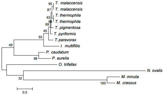 - Brunk, C.F.; Lee, L.C.; Tran, A.B.; Li, J. Complete sequence of the mitochondrial genome of Tetrahymena thermophila and comparative methods for identifying highly divergent genes. Nucleic Acids Res. 2003, 31, 1673–1682. [Google Scholar] [CrossRef] [PubMed]