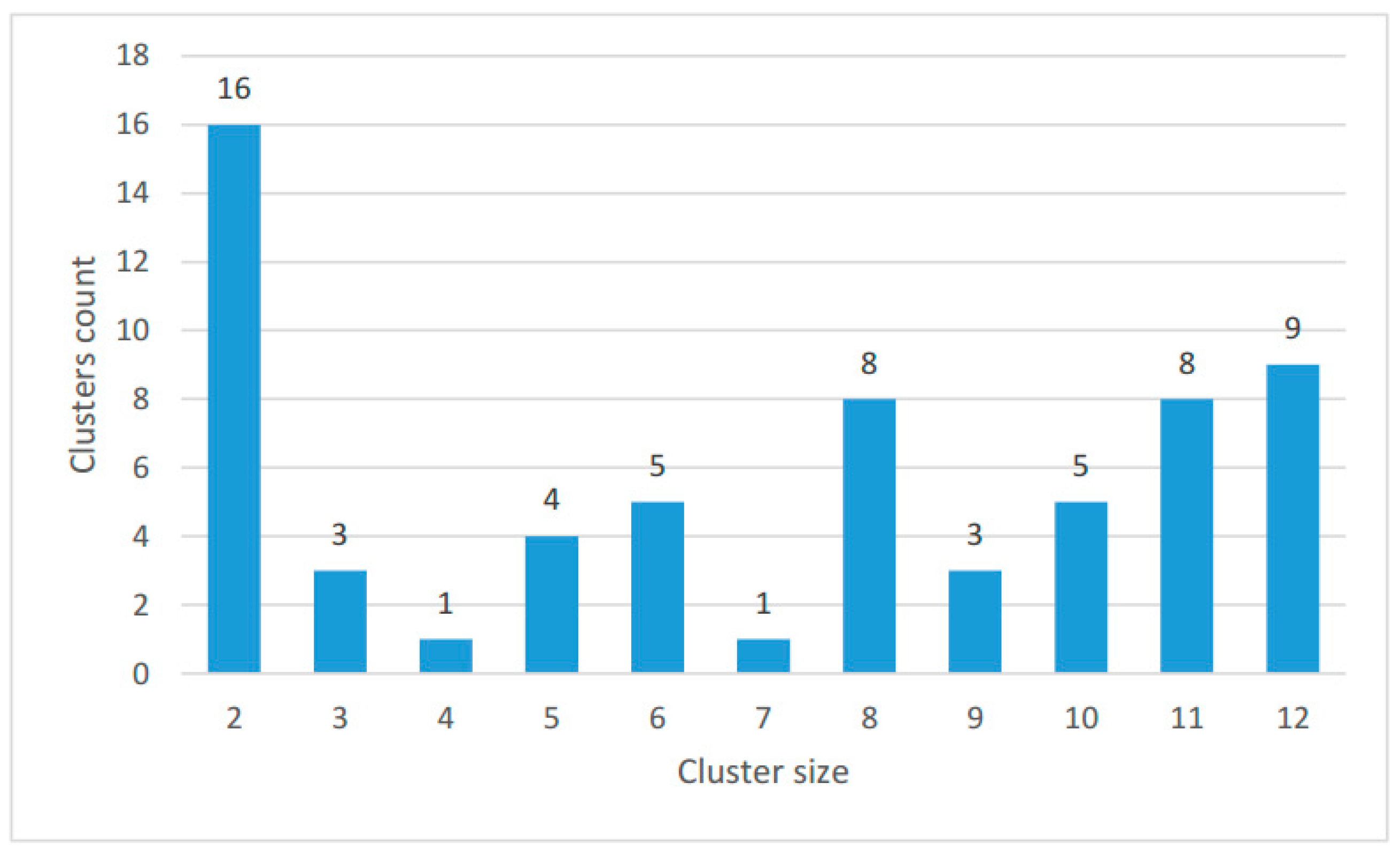 Size distribution of the clusters. The bar height shows the number of clusters including proteins from the number of species indicated on the abscissa.