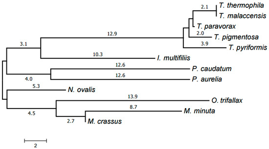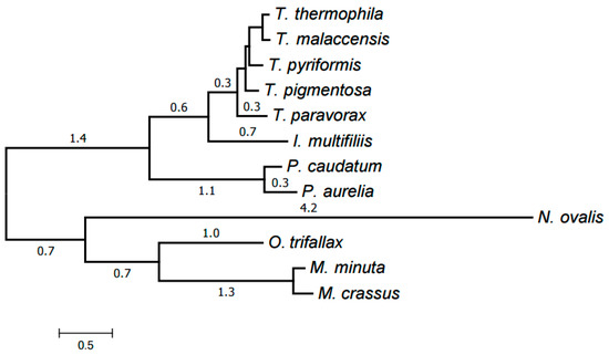 The mitochondria considered here code for tens of proteins [4,7,8,9,10,11,12,13,14,15]. The functions of some of them remain unclear, and they relatively rapidly accumulate substitutions [16]. The mitochondrial chromosome is circular in Ichthyophthirius and linear in other species considered here [15,17]. In the mitochondria of Tetrahymena, Moneuplotes, and Oxytricha, most genes are transcribed in opposite directions from the middle of the linear chromosome. In contrast, most genes are transcribed in the same direction in the mitochondria of Paramecium and Nyctotherus.