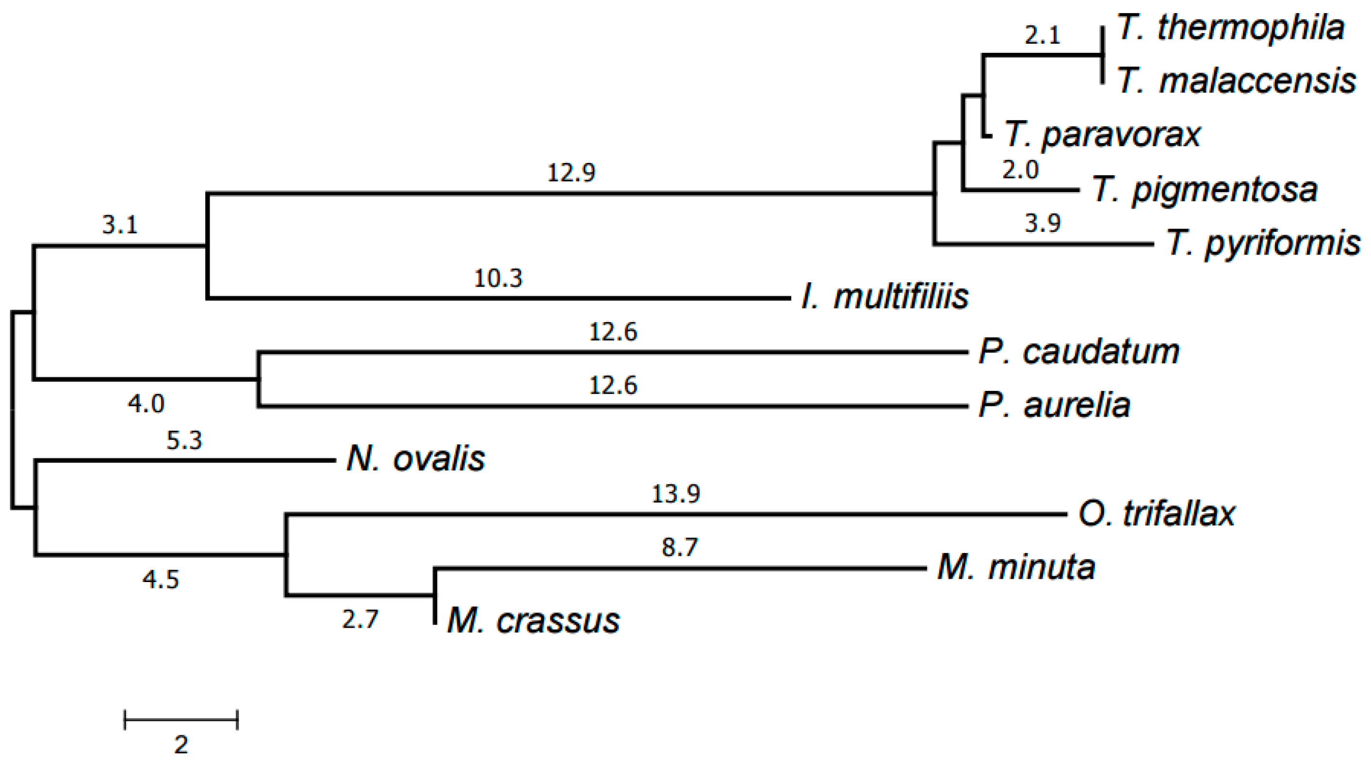2.2. Clustering of Proteins Encoded in Mitochondria in Ciliates