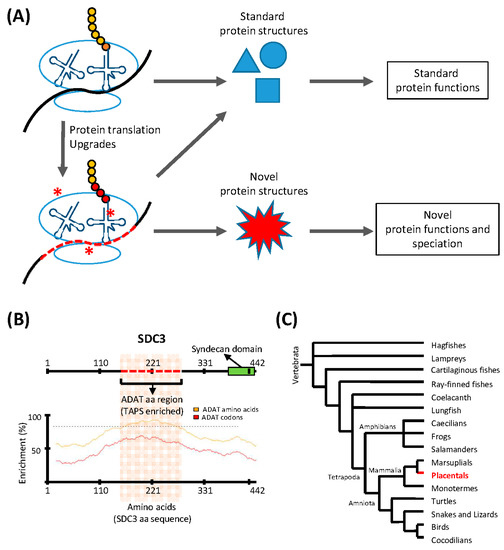 Translation upgrades may lead to novel protein structures and drive speciation. (A) The translation machinery is capable of synthesizing a finite number of standard protein structures, and translation ‘upgrades’ (red asterisks) such as codon usage adaptations, or modulation of the tRNA pool, allow the translation machinery to synthesize proteins with novel structures and functions. This process may drive speciation; (B) An example of a gene (SDC3) containing a region with a sequence highly enriched in ADAT-related amino acids (red dashed line; upper panel). The codon composition of the DNA coding for this domain is highly biased towards triplets recognized by tRNAs modified by ADAT. The lower panel shows the enrichment in ADAT-related amino acids (yellow line) and ADAT-dependent codons (red line) across the whole sequence of SDC3. The dashed line marks an enrichment level of ADAT-dependent codons of 80%; (C) Consensus phylogeny for Vertebrata. SDC3 belongs to the syndecan proteoglycan family found solely in placentals (highlighted region). The activity of ADAT may have contributed to the emergence of SDC3-type domains in placentals.