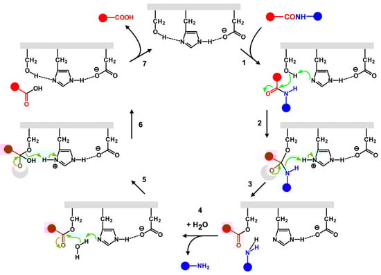 The mechanism of the serine triad catalysis is one of the most understood of all enzymatic activities (Figure 2). The three groups act as a nucleophile (serine hydroxyl), base catalyst (histidine imidazole ring) and an orienting/stabilizing group (aspartate) [70]. Histidine is bound and stabilized by aspartate in such a way that it polarizes the nucleophile, thus allowing it to successfully perform nucleophilic attack on the substrate (usually the carbonyl carbon of a peptide). Carbonyl oxygen accepts an electron, and a tetrahedral intermediate stabilized by the oxyanion hole is formed. The electrons from carbonyl oxygen collapse back to the carbonyl carbon, ejecting half of the substrate. The other half of the substrate is still bound to the enzyme forming the acyl-enzyme intermediate. The acyl-enzyme intermediate is then attacked by another nucleophile from the environment. Briefly, another tetrahedral intermediate is formed, which then ejects the enzyme while releasing the product. If the new nucleophile is water, the result is hydrolysis, if it is another organic substrate the result is acyl transfer.