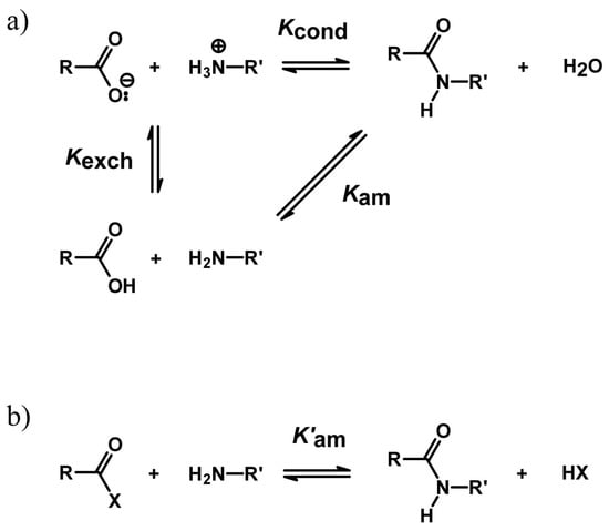 From a prebiotic chemistry perspective, hydrolysis (proteolysis) is not a desired catalytic activity. Synthesis (condensation, reverse proteolysis) is preferred, as these reactions can drive the formation of even more complex molecules. However, as we have earlier mentioned, hydrolysis is thermodynamically favored in aqueous environments. Following the discussion presented by several authors [24,46,83], the condensation reaction between two charged amino acids (or peptides) in water is composed of two elementary steps, namely a proton exchange process and an aminolysis reaction, defined in Figure 3a (). It follows that the condensation equilibrium constant () can be written as the product between the proton exchange constant () and the aminolysis constant (). is the ratio between the acidity constants of free amino acid terminal ammonium ion (10−8–10−9) and carboxylic acid (10−2–10−3).