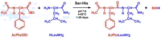 Ser-His catalyzed peptide formation [18]. N-protected and C-activated phenylalanine residue (AcPheOEt) reacts with C-protected leucine residue (HLeuNH2) to give ethanol and the desired dipeptide (AcPheLeuNH2) in a 20%–50% yield (depending on incubation time, up to 30 days), at pH 7–9 (Britton–Robinson buffer was used, including acetate, phosphate and borate). The reaction has been tested from 4–65 °C and runs well also in the presence of cupric ions and urea. Note that AcPheLeuNH2 precipitates in the reaction conditions, shifting the equilibrium to the right. As a comparison, if -chymotrypsin is used instead of Ser-His, the reaction occurs in a few minutes. Together with aminolysis, AcPheOEt hydrolysis is observed (AcPheOH).