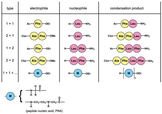 The potential role of fragment condensation in generating long biopolymers has not been widely discussed in the literature, probably because most of the studies focus on mimicking the biological synthesis of biopolymers, which proceeds via template-directed chain elongation. Nucleic acids and protein elongation mechanisms rely on the same recognition strategy, based on how complementary the nucleotides are. On the other hand, one could speculate that primitive peptide fragment condensation is totally random or that it is guided by molecular recognition (e.g., peptide-peptide or peptide-catalyst). The latter could act as a selection rule in the combinatorial space of potentially reacting peptides. If fragment condensation had played a role in prebiotic times, then that role would have been functional, endowing the early molecular systems with the first long-enough (and thus, likely folded) proteins . Such a scenario could have anticipated and facilitated the path toward the more sophisticated template-based chain elongation.
