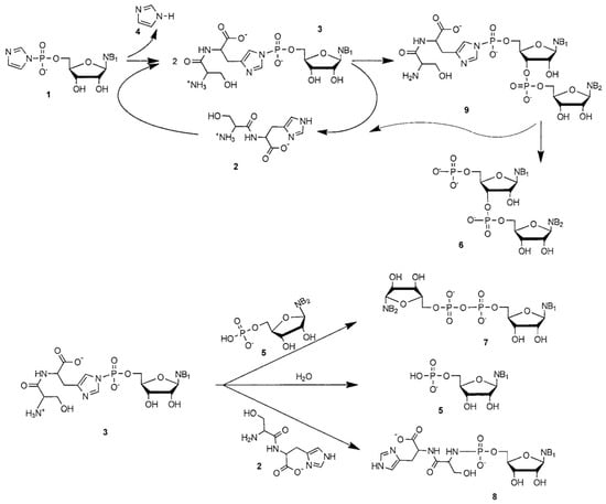 The reaction proceeds much like other RNA polymerizations from imidazole-activated nucleotides. The presence of an imidazole ring covalently attached to 5′ phosphorus draws electron clouds away, thus allowing for a partial positive charge to form on the atom. It is subsequently attacked by 2′- or 3′- nucleophilic oxygen from 2′- or 3′-hydroxyl of another nucleotide. Imidazole is released, and a phosphodiester bond is formed. The mechanism is very similar in the presence of Ser-His. The initial step is a transamination reaction with imidazole being replaced by the Ser-His histidine ring. Because of structural similarity, the Ser-His-capped nucleotide is also an activated form of the nucleotide, like 2-methyl-imidazole, or 2-amino-benzimidazole, or 1-methyl-adenine [94]. The Ser-His-capped intermediate reacts with all nucleophiles present in the system to give the desired dinucleotide, a pyrophosphate dimer, and the unactivated nucleotide, respectively (Figure 6). It can also react with the free terminal amino group of Ser-His to give a N-phosphate peptide-nucleotide adduct. It is unclear whether the reaction of the Ser-His-capped nucleotide with the various nucleophiles proceeds by intramolecular catalysis (e.g., because of specific structural arrangement allowing bound Ser-His to actively take part in the reaction), intermolecular catalysis (e.g., by the involvement of a second Ser-His molecule) or just because the presence of the Ser-His cap as the leaving group is more effective towards polymerization than the bare imidazole.