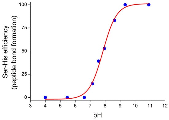Much less is known about the mechanism of peptide formation (Section 4.2). In this case, the pH dependence of peptide formation has been determined [18] for the system of Figure 4. It follows a neat sigmoidal profile with an inflection point at pH 7.85 (Figure 7), suggesting that the reaction product is generated by a mechanism where the deprotonation of an acid moiety with a pKa around such a value is fundamental. Although it is not surprising that in many proteins the imidazole pKa can differ (also largely) from the standard value of about six, depending on the micro-environment [95], in this specific case, it seems that the protonation status of imidazole of Ser-His does not play a key role. The three Ser-His pKa values are reported to be 2.42 (carboxyl), 6.71 (imidazole) and 7.70 (amino) [96]. It follows that if the rate-determining step is the initial interaction between Ac-Phe-OEt and Ser-His, the Ser-His terminal amino group might act under the general base catalysis scheme, facilitating the nucleophilic attack of another Ser-His molecule to the ester. If, on the other hand, the rate-determining step is the attack of the leucinamide terminal amino group to the carbonyl carbon, the dominant factor is the availability of such unprotonated amino group on the N-end of the H-Leu-NH2. More detailed studies are needed to clarify these mechanistic aspects. In any case, the mechanism of Ser-His-Asp action is expected to be the same as Ser-His with the carboxyl group of Asp and the carboxyl C-end of Ser-His performing a similar function in the overall mechanism.