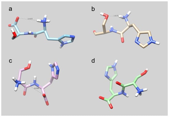 Molecular models of (a) Nδ–H His-Ser, (b) Nϵ–H His-Ser, (c) Nδ–H Ser-His and (d) Nϵ–H Ser-His, as obtained after 1-ns molecular dynamics simulations in explicit solvent.