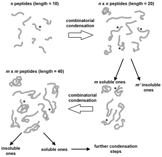 Peptide fragment condensation (adapted from [101]). Condensation scheme of n peptides (10 amino acids long) to yield ideally peptides (20 amino acids long), of which only m are soluble, and undergo further random fragment condensation yielding peptides (40 amino acids long), of which only a few will be water soluble. By continuing this procedure, we reach long chains that are soluble and that can be seen as the product of a prebiotic molecular evolution. The asterisk indicates a catalytic center, capable of inducing peptide synthesis. The synthesis can be in principle also induced by an external catalytic peptide. Reproduced from [20] with the permission of the authors.