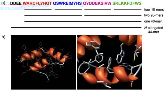 This hypothetical scenario has not been proven experimentally, but operating by the Merrifield synthesis, it has been shown how it could work in practice. Chessari et al. [102] showed that eight random 10-mer peptides, whose random sequences were generated by computers, were divided into two groups and combined to give sixteen 20-mers, which were all synthesized individually and subjected to solubility test. The four more soluble ones were next combined with four other 20-mers to give sixteen 40-mers. Two of these 40-mers, which were partially soluble, were further elongated to the N-terminus with a four hydrophilic amino acid tail (DDEE), to give two 44-mers, one of which was soluble in water (Figure 10a). Circular dichroism indicates ca. 22 residues in -helix conformation, in agreement with simple predictions based on primary sequence analysis. Three-dimensional modeling (ROKKY protein folding suite [105]) suggests that the peptide folds as three -helices around a hydrophobic core (Figure 10b).
